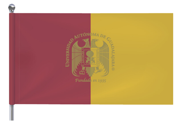 El cóndor aprisiona un libro en su garra y el águila una maza azteca con pedernales. En el centro se encuentra el conocido escudo de la ciudad de Guadalajara, que fue concedido por el emperador Carlos V de Alemania y I de España, el 8 de noviembre de 1539. En la orna se han dejado sólo las aspas de las esquinas para dejar lugar al lema de la Universidad “Ciencia y Libertad”, en correspondencia al libro y a la maza, es una clara alusión de que para defender nuestra libertad debemos recurrir a todas las posibilidades.