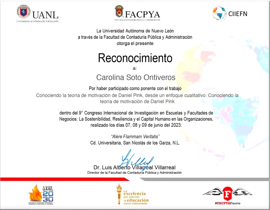 La Mtra. Carolina Soto Ontiveros, académica de la Universidad Autónoma de Guadalajara (UAG) participó como ponente de su trabajo “Conociendo la teoría de motivación de Daniel Pink, desde un enfoque cualitativo: conociendo la teoría de motivación Daniel Pink”, en el “IX Congreso Internacional de Investigación en Escuelas y Facultades de Negocios: La Sostenibilidad, Resiliencia y el Capital Humano en las Organizaciones”.