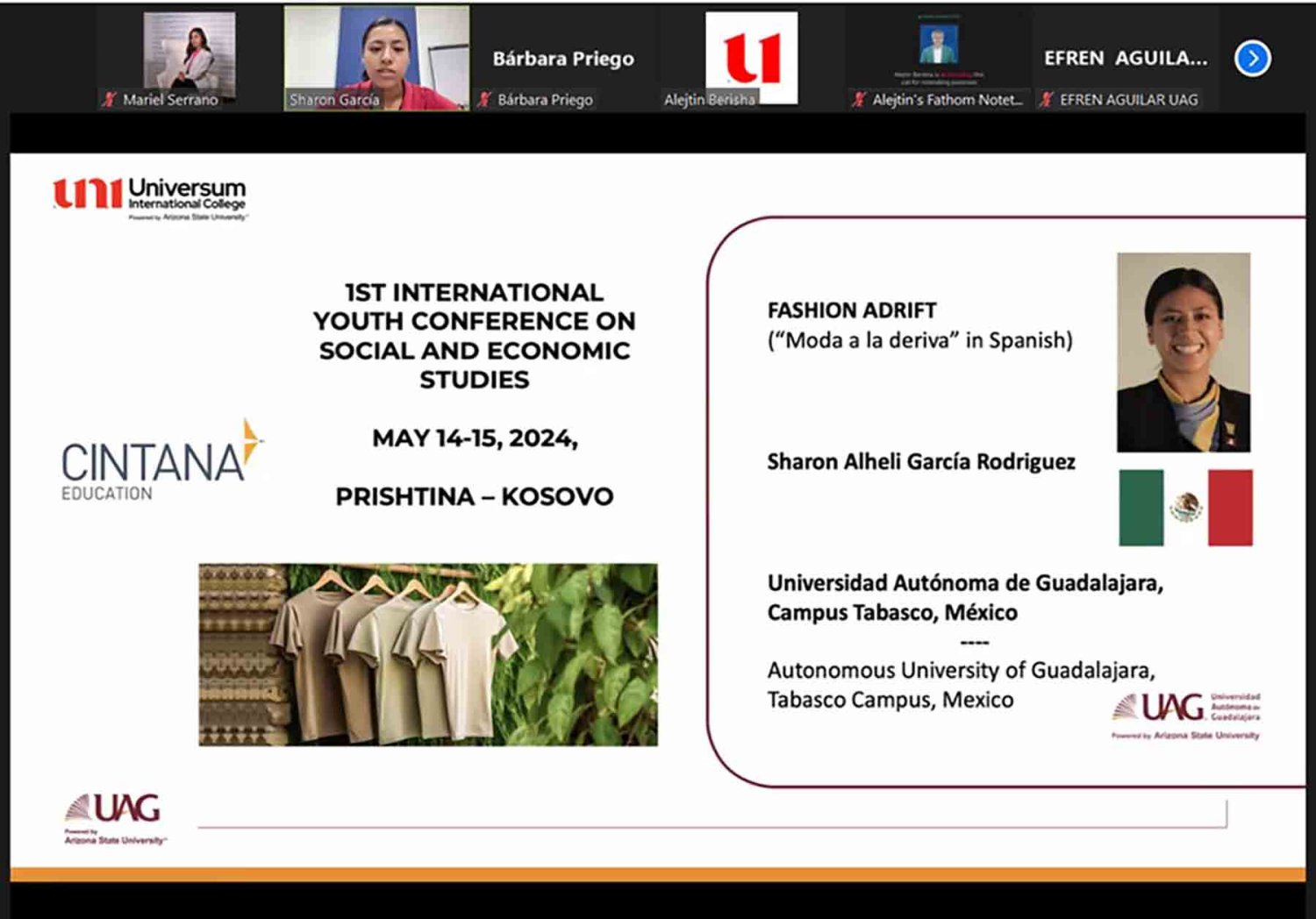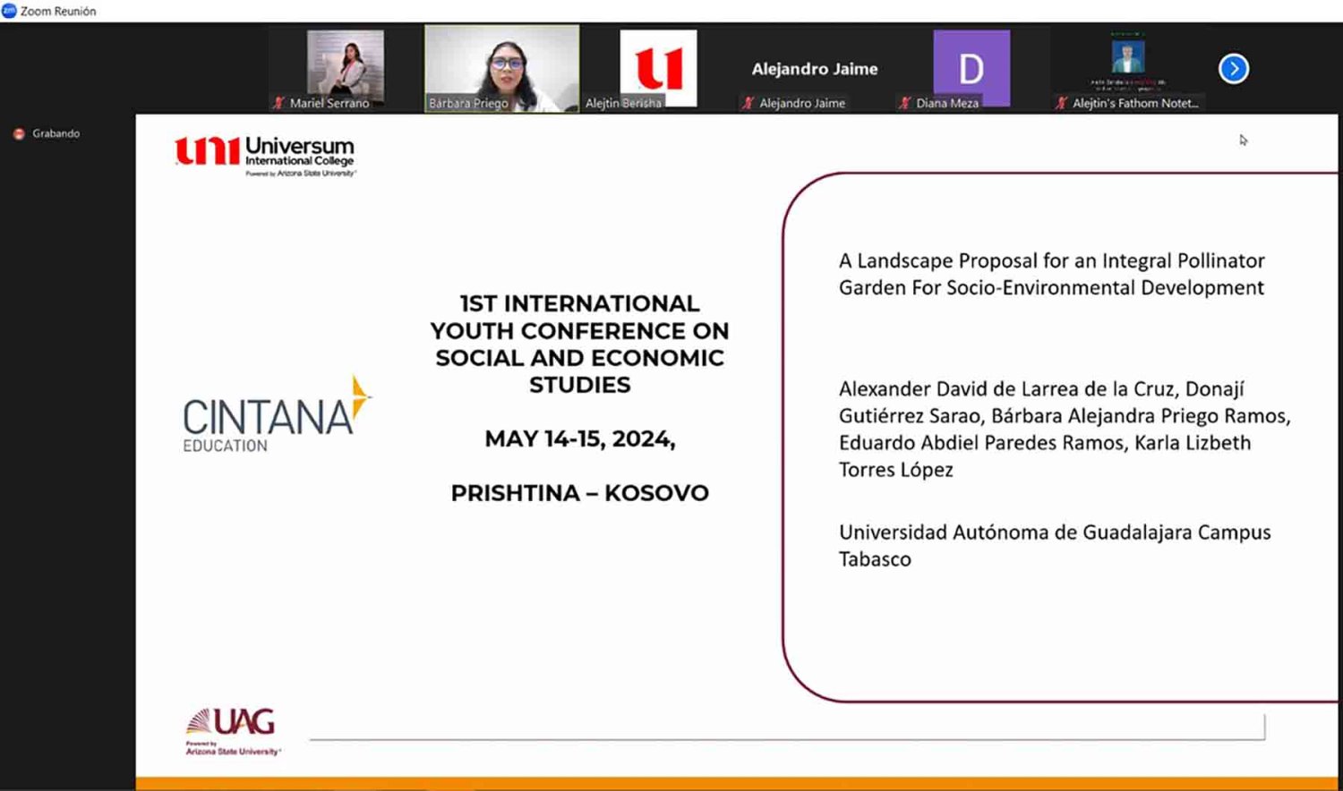 Las alumnas Alejandra Ramón de la Cruz, Katherine Itzel Garrido López y Yulissa Yovana Sánchez Pérez, estudiantes de Arquitectura del Campus Tabasco de la Universidad Autónoma de Guadalajara (UAG), obtuvieron el primer lugar en el “1st International Youth Conference on Social and Economic Studies”, organizado por la UAG y la Universum International College, de Kosovo, que se realizó de manera virtual.