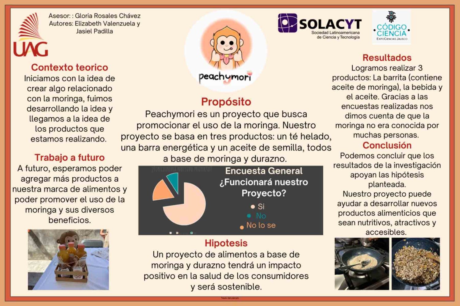 El proyecto lo iniciaron el tercero de secundaria y continuó durante todo un ciclo escolar hasta preparatoria. Su idea consiste en conjuntar moringa y durazno en un alimento, elementos con los que fabricaron una barra, bebida y aceite de semilla, que puede convertirse en un suplemento alimenticio saludable para cualquier persona, en especial para diabéticos.