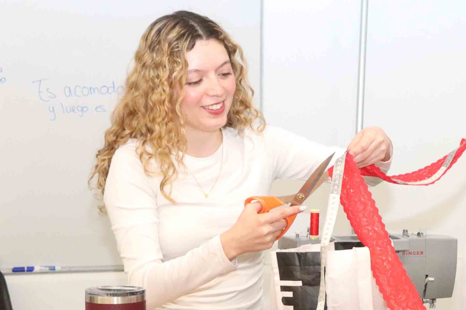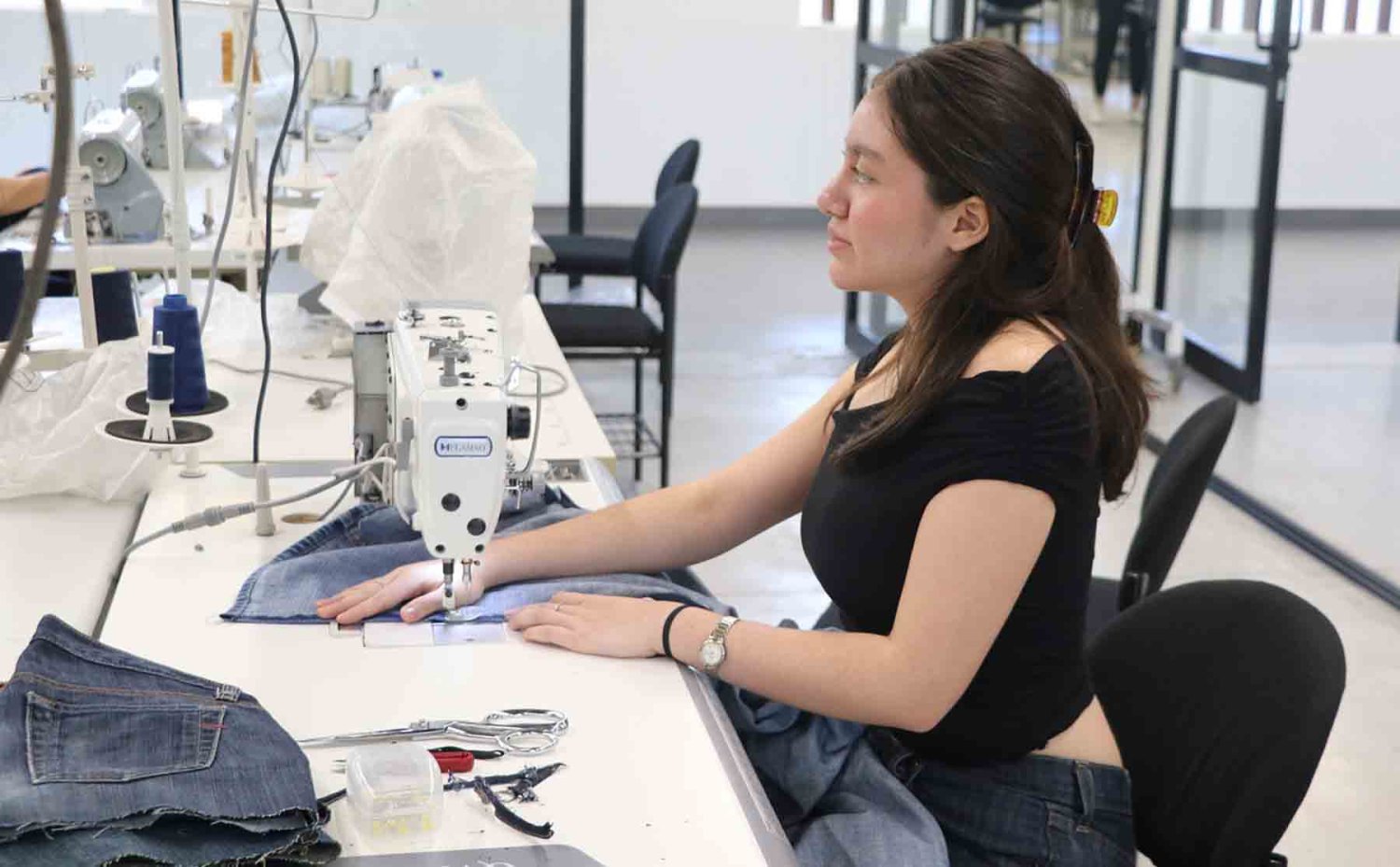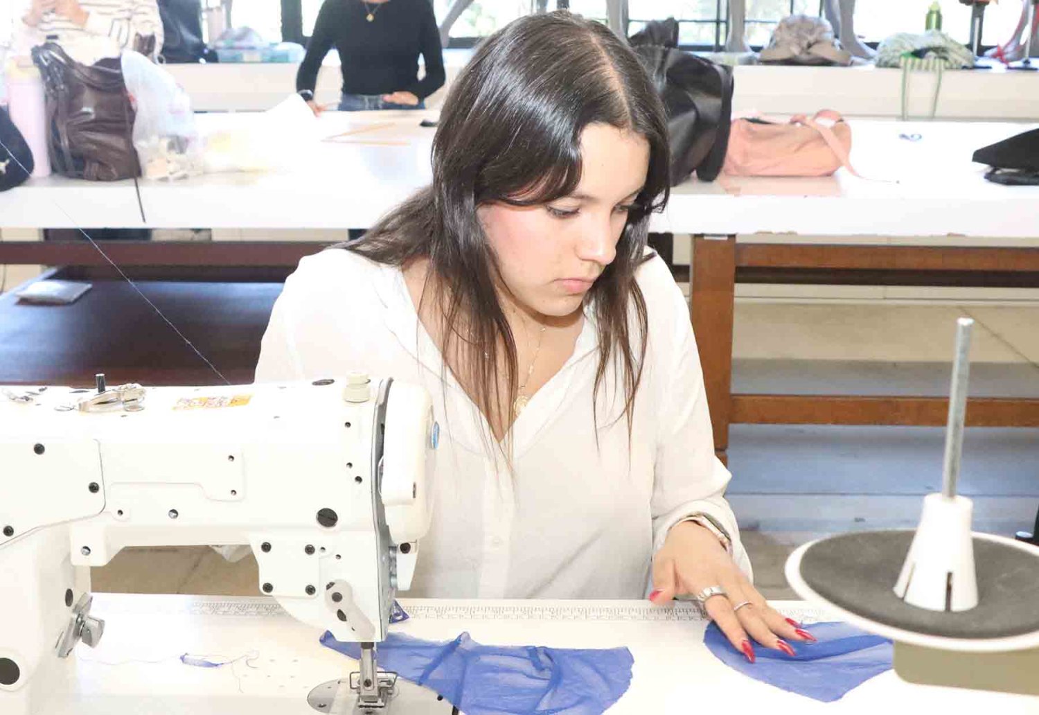 “Desde el inicio, los alumnos tienen contacto directo con las máquinas de coser industriales, aprenden las técnicas básicas de costura y patronaje, y van perfeccionando su técnica a lo largo de su carrera”, comentó Lesprón Farías.