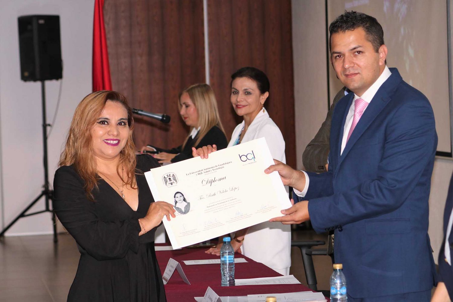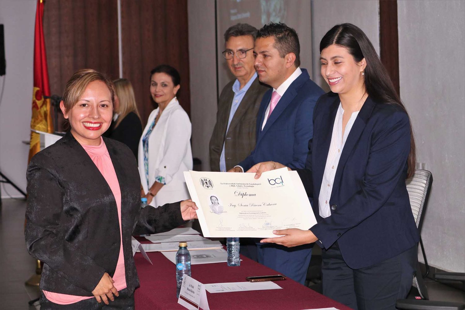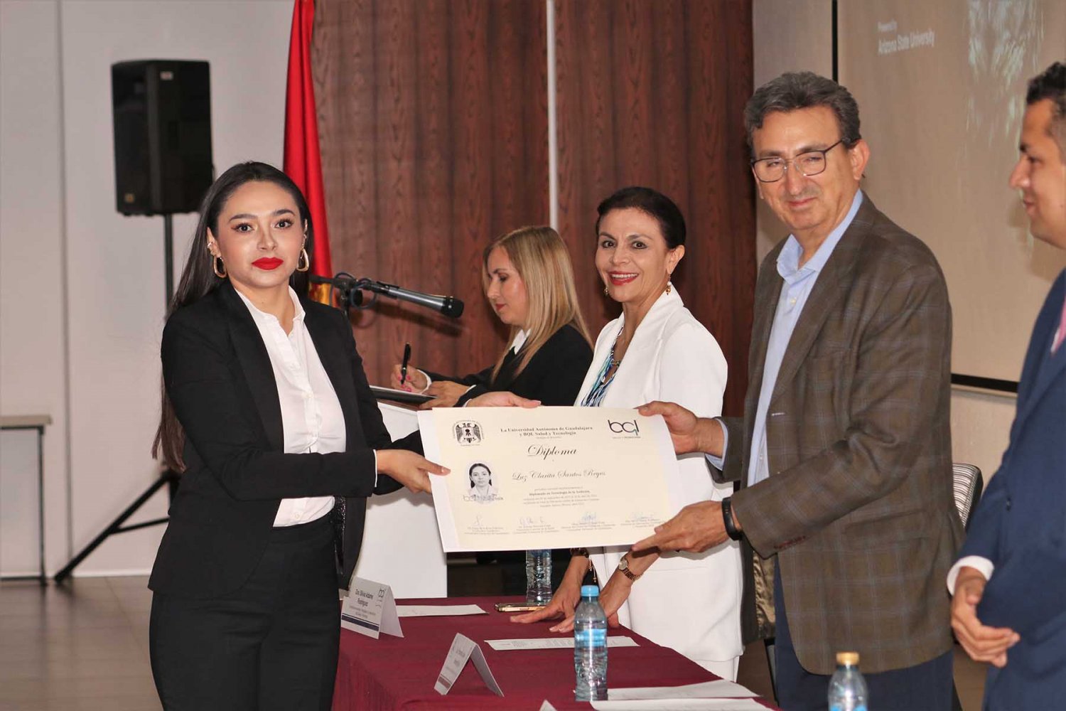 En el evento también estuvieron presentes la Jefa de Educación Continua en Salud de la UAG, Lic. Priscila Malacara Sánchez, y la Directora de Innovación, Investigación uy Desarrollo de BQL, Salud y Tecnología, Dra. Silvia Adame Rodríguez