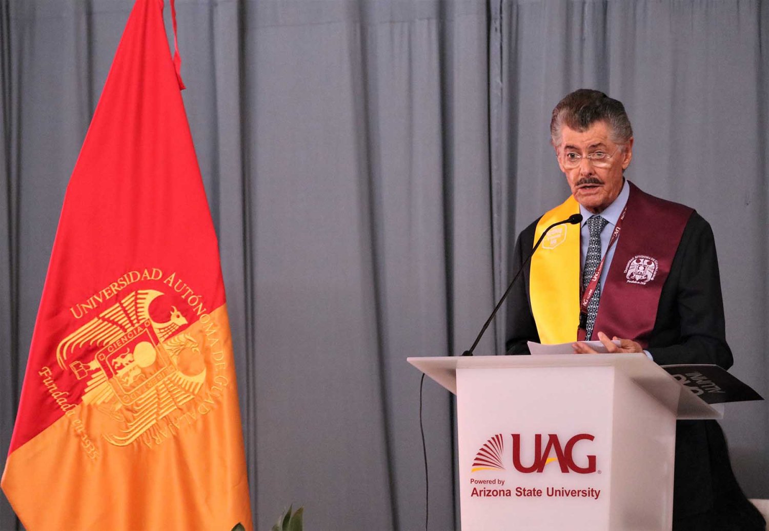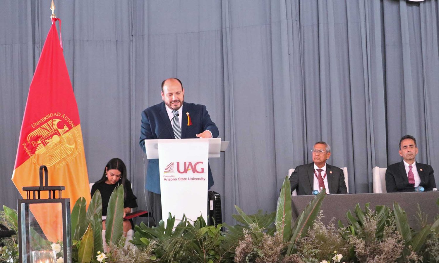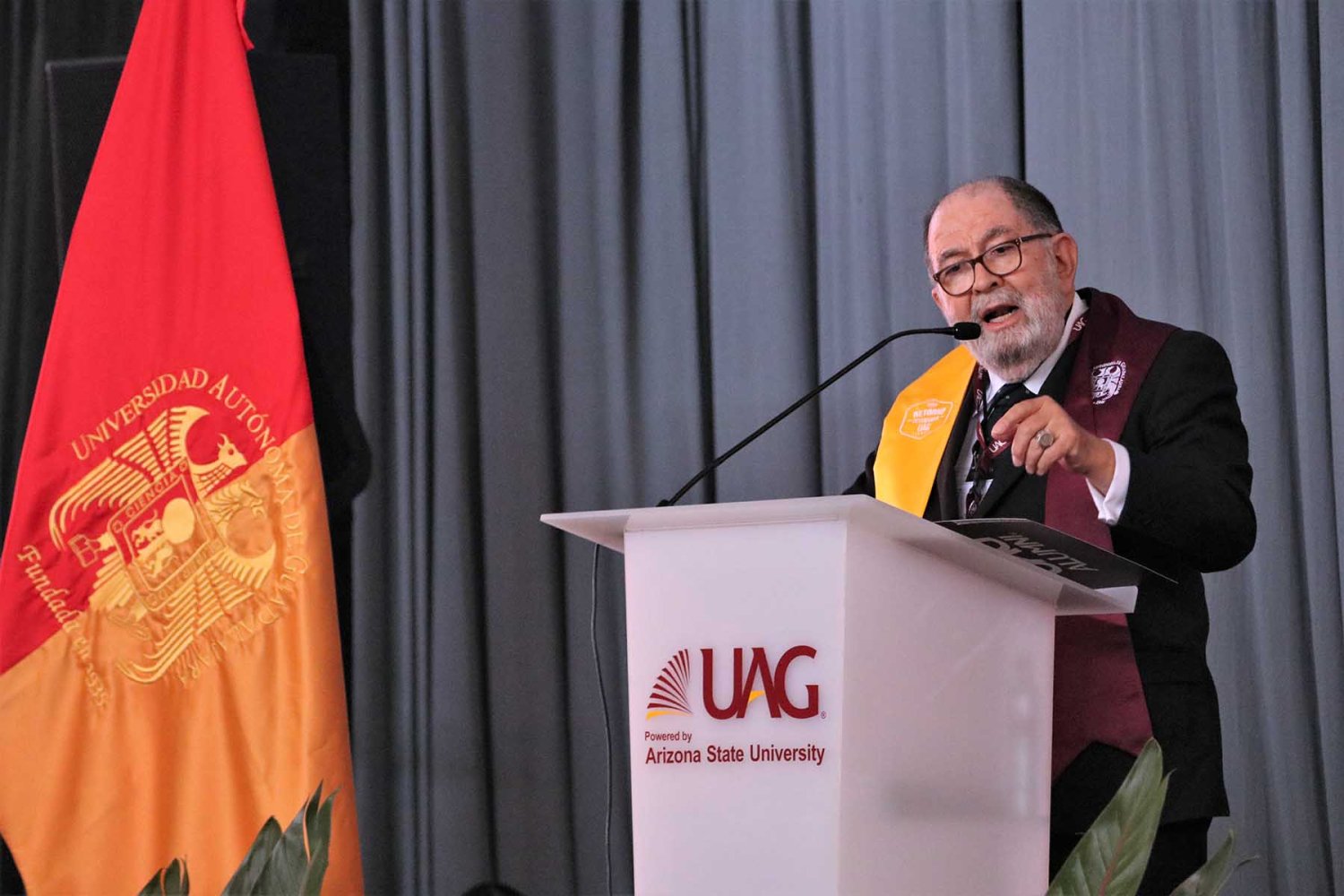 El Lic. Leaño Reyes continuó su discurso resaltando que a lo largo de su historia la UAG siempre ha trabajado por la calidad educativa y prestigio de esta institución, muestra de ello es las recientes alianzas con Arizona State University y CINTANA Education, aliados que impulsarán la formación de líderes innovadores de clase mundial.