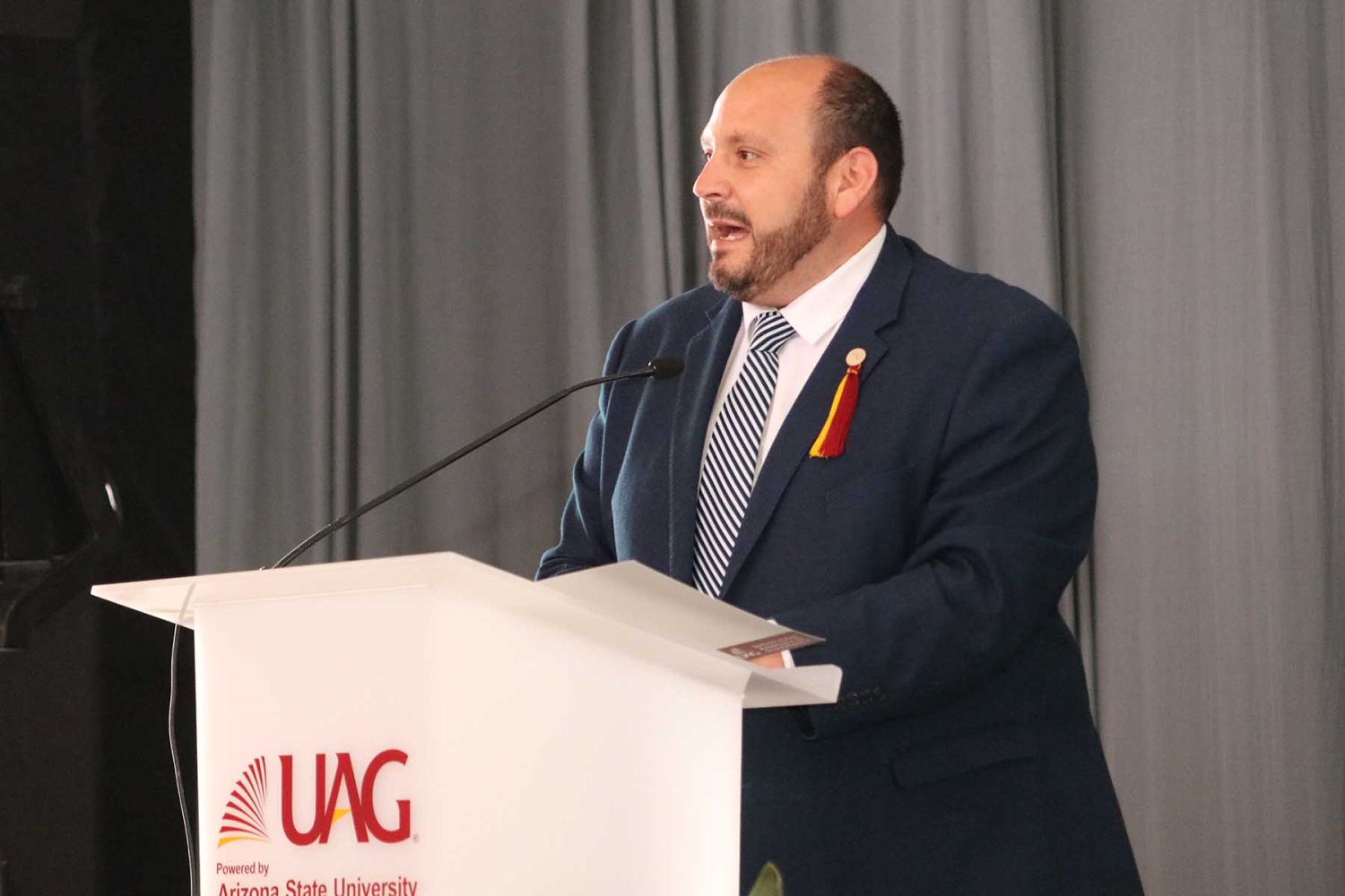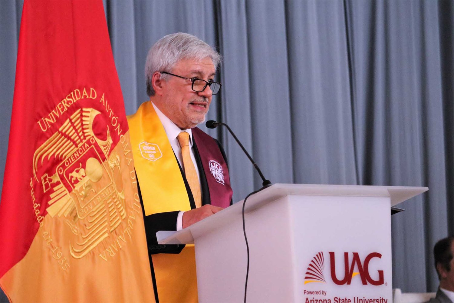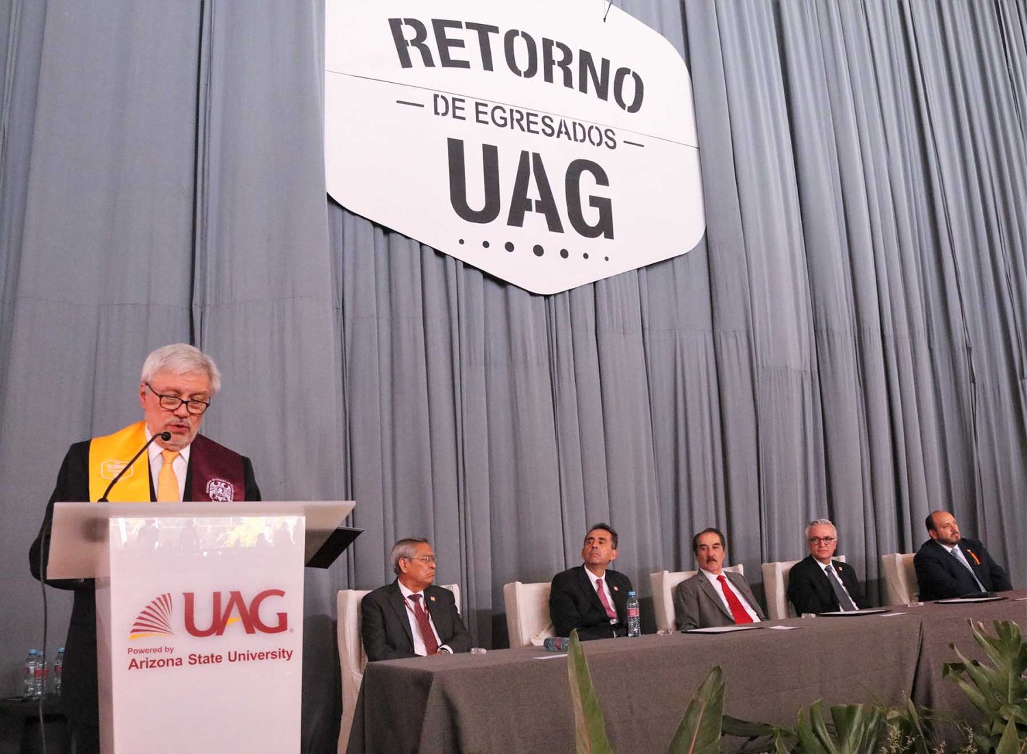 El Lic. Leaño Reyes continuó su discurso resaltando que a lo largo de su historia la UAG siempre ha trabajado por la calidad educativa y prestigio de esta institución, muestra de ello es las recientes alianzas con Arizona State University y CINTANA Education, aliados que impulsarán la formación de líderes innovadores de clase mundial.