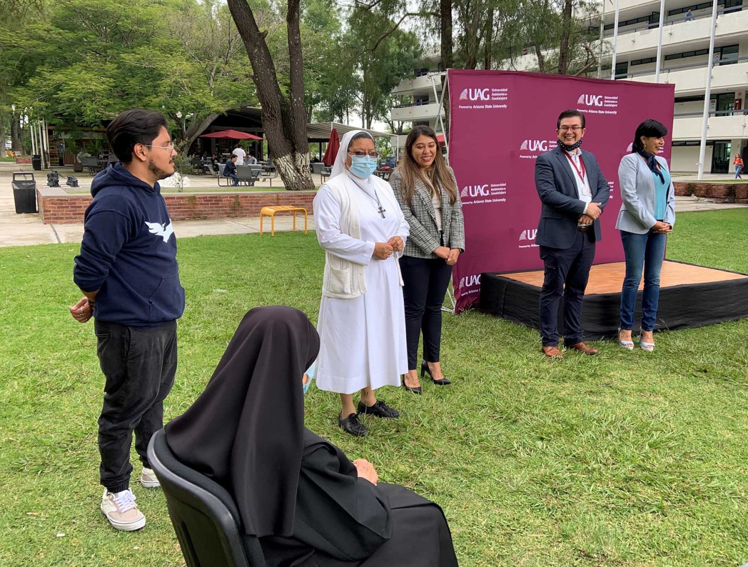 La entrega simbólica de los alimentos se realizó en el jardín del Edificio B de Ciudad Universitaria y también asistieron el Mtro. Ángel Israel Muñoz Hernández, Decano de CSEA; la Mtra. Gabriela Rosales, académica; la Lic. Lorena Lugo, Coordinadora de Proyectos de la Dirección de Asistencia Social; y Alonso Valeriano Carballido, estudiante de Administración y representante del club “Teco Hope”.