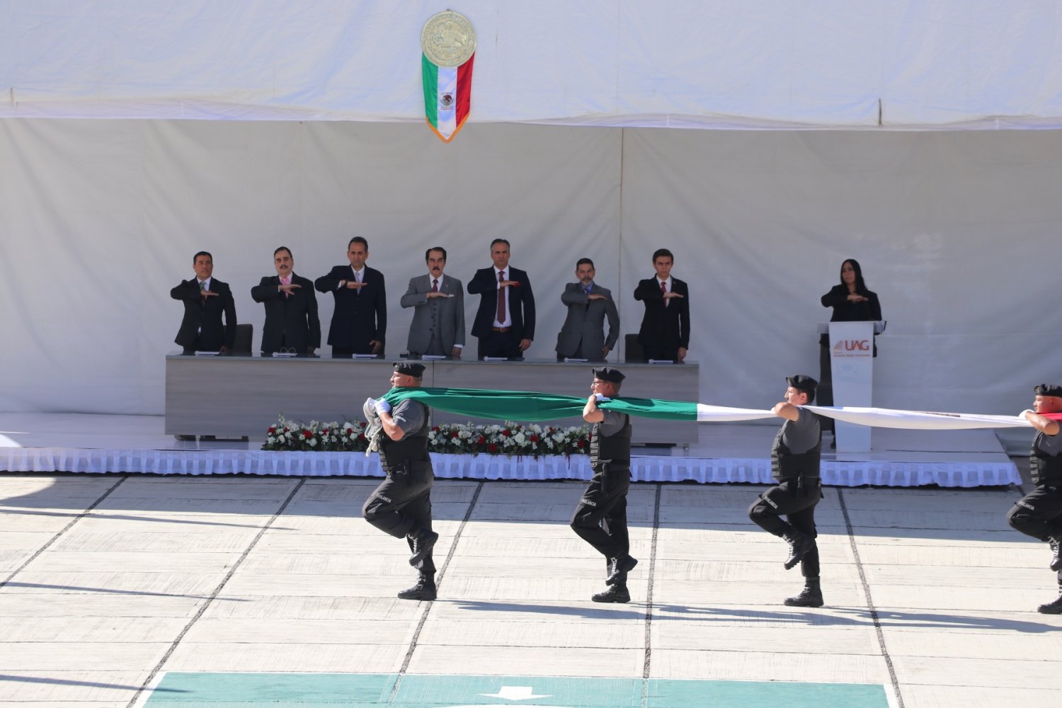 En este acto, presidido por el Lic. Antonio Leaño Reyes, Rector de la UAG, el Vicerrector Administrativo, Mtro. Juan Carlos Leaño del Castillo, tomó la palabra para señalar la importancia histórica, cultural, de identidad y orgullo, que significa para los mexicanos esta insignia.