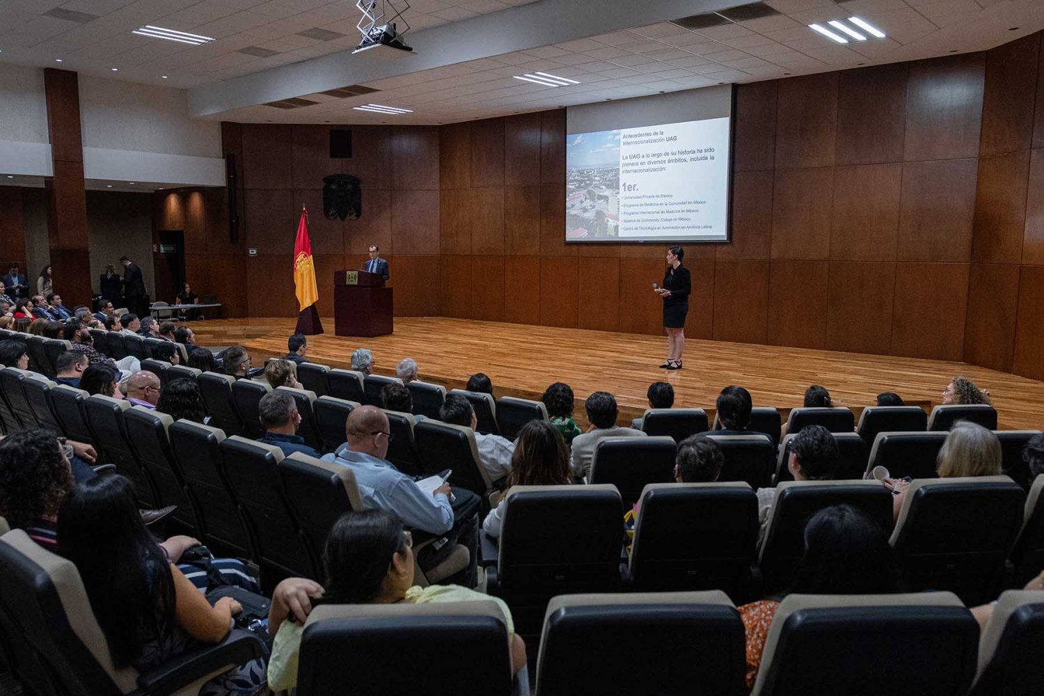 Como parte de las actividades académicas se llevó a cabo la conferencia “Estrategias y actividades clave en la educación internacional”, expuesta por el Mtro. Fernando Torres de la Torre, Director de Internacionalización, y la Mtra. María Fernanda Flores Álvarez, encargada de Intercambios Internacionales de la UAG.