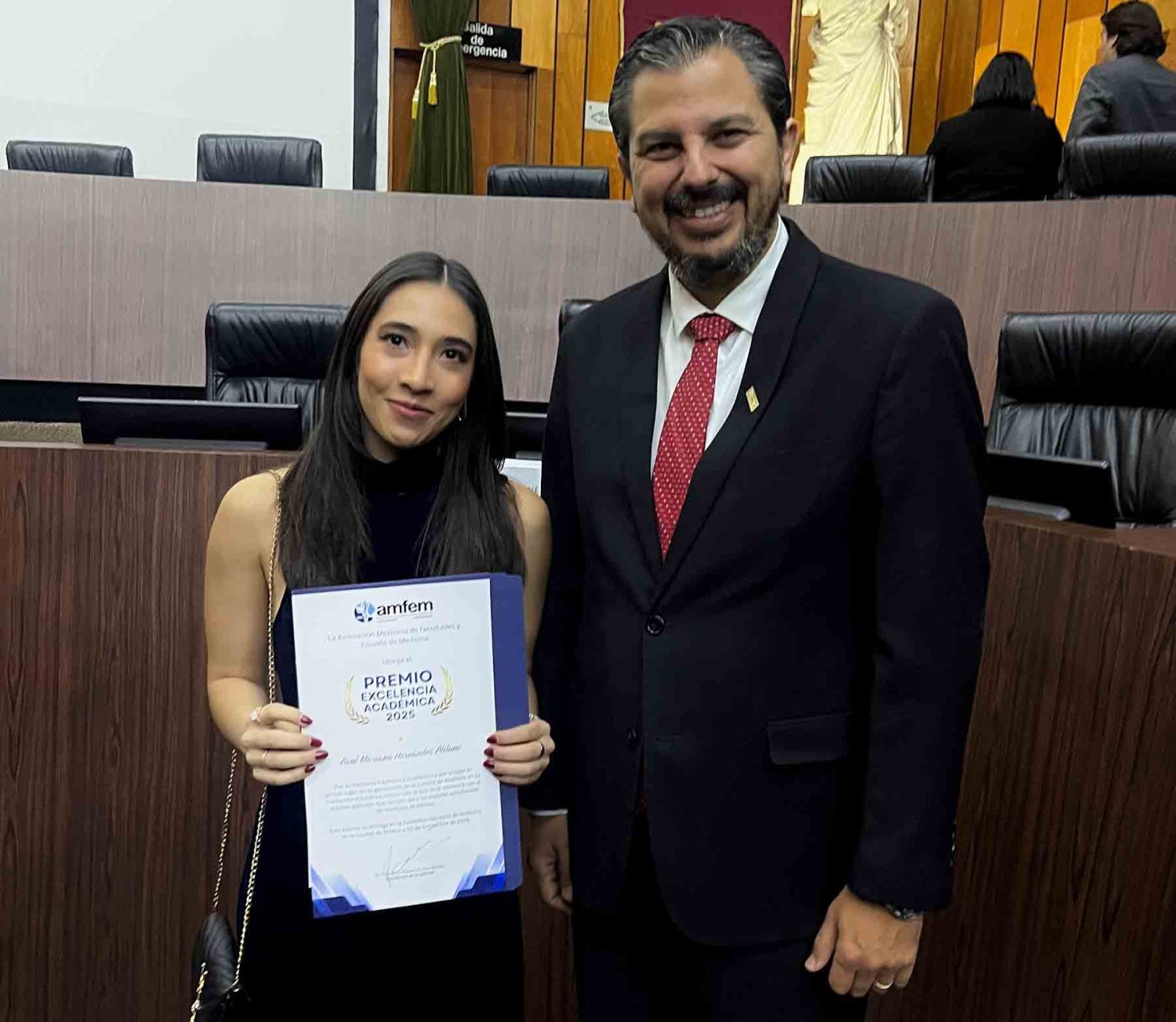 La Dra. Azul Mariana Hernández Atilano, egresada en el 2024 de la Carrera de Médico Cirujano de la Universidad Autónoma de Guadalajara (UAG), recibió el Premio a la Excelencia Académica, que entrega la Asociación Mexicana de Facultades y Escuelas de Medicina (AMFEM).