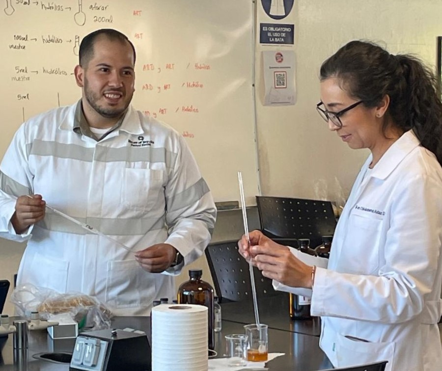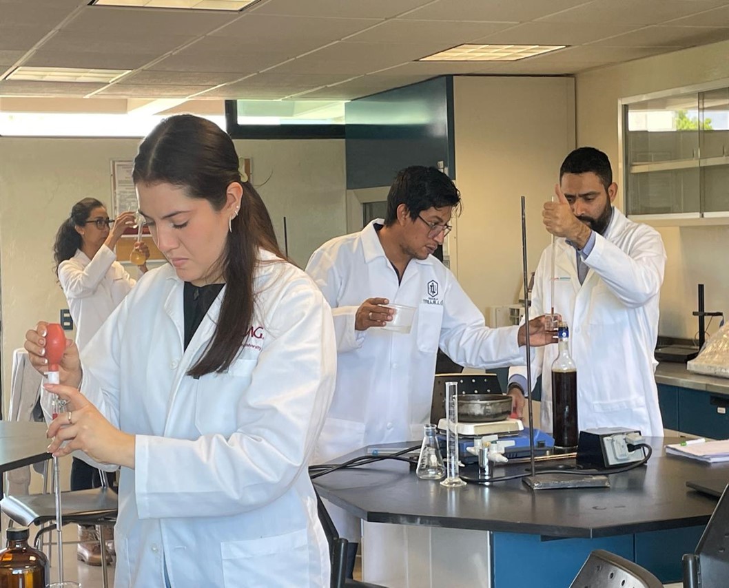 Estudiantes de la Maestría en Procesos del Tequila, de la Universidad Autónoma de Guadalajara (UAG), que cursan las materias de fermentaciones e hidrólisis realizaron prácticas de laboratorio para conocer las técnicas de análisis de azúcares reductores y azúcares reductores totales en el Agave tequilana Weber, materia prima para la producción de Tequila.