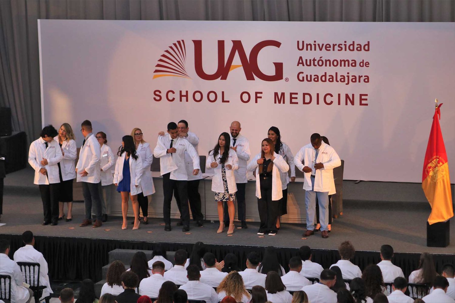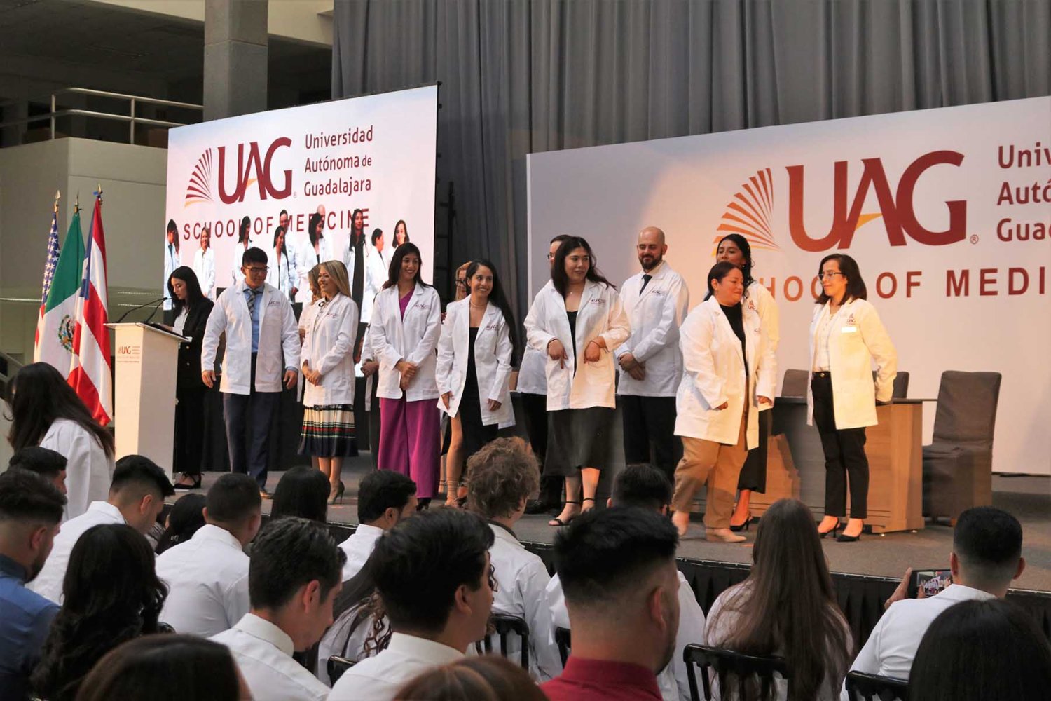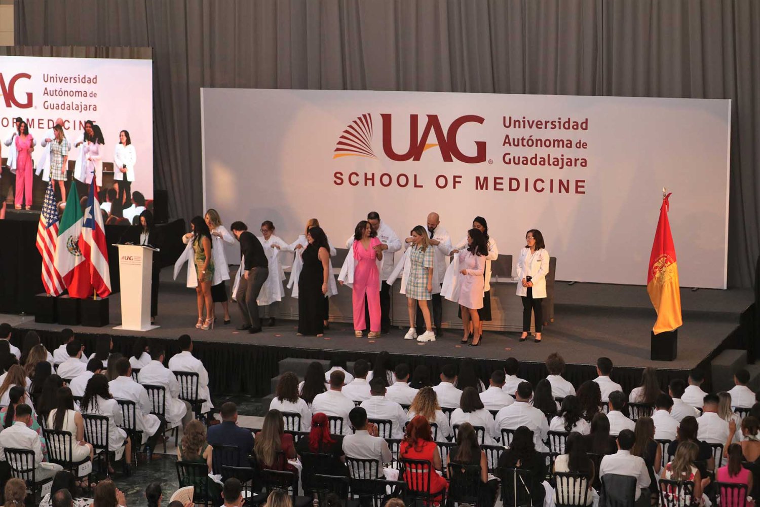 En esta ocasión, la UAG le dio la bienvenida a los nuevos estudiantes que se incorporan al Programa Internacional de Medicina (PIM) y se les impuso su primera bata blanca, la cual simboliza el compromiso con la profesión médica y su inicio como médicos en formación.