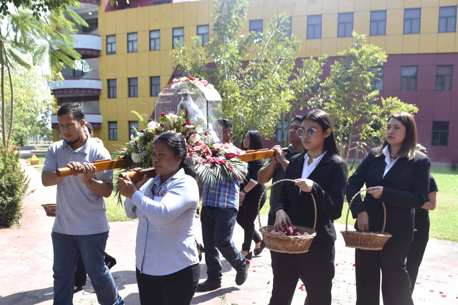 Acompañada por una procesión de estudiantes, docentes y colaboradores, la Virgen de Zapopan recorrió parte del Campus Tabasco, mientras resonaban alabanzas y muestras de veneración hacia la figura religiosa.