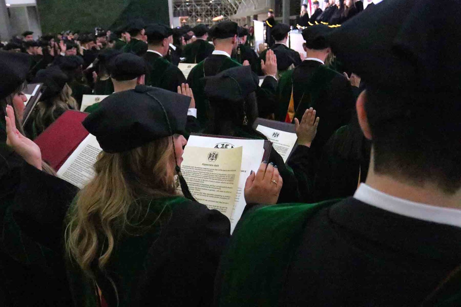 Después de estos mensajes se realizó la entrega de diplomas que avalan el término de estudios de los graduados; luego se tomó el Juramento Hipocrático a los nuevos médicos, llevado por la Dra. Miranda Robledo Amezcua, Directora Académica.