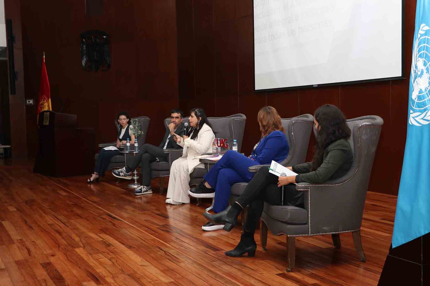 General del Laboratorio de Ciencia en la Ciudad; la Mtra. Gabriela Méndez, Directora de Inclusión a Personas con Discapacidad del Estado de Jalisco; Camila Rodríguez de la Fuente, alumna de la Lic. en Relaciones Internacionales de la UAG; y la Dra. Dulce Esmeralda García Ruiz, Profesora Investigadora de la UAG, quien fue la moderadora.