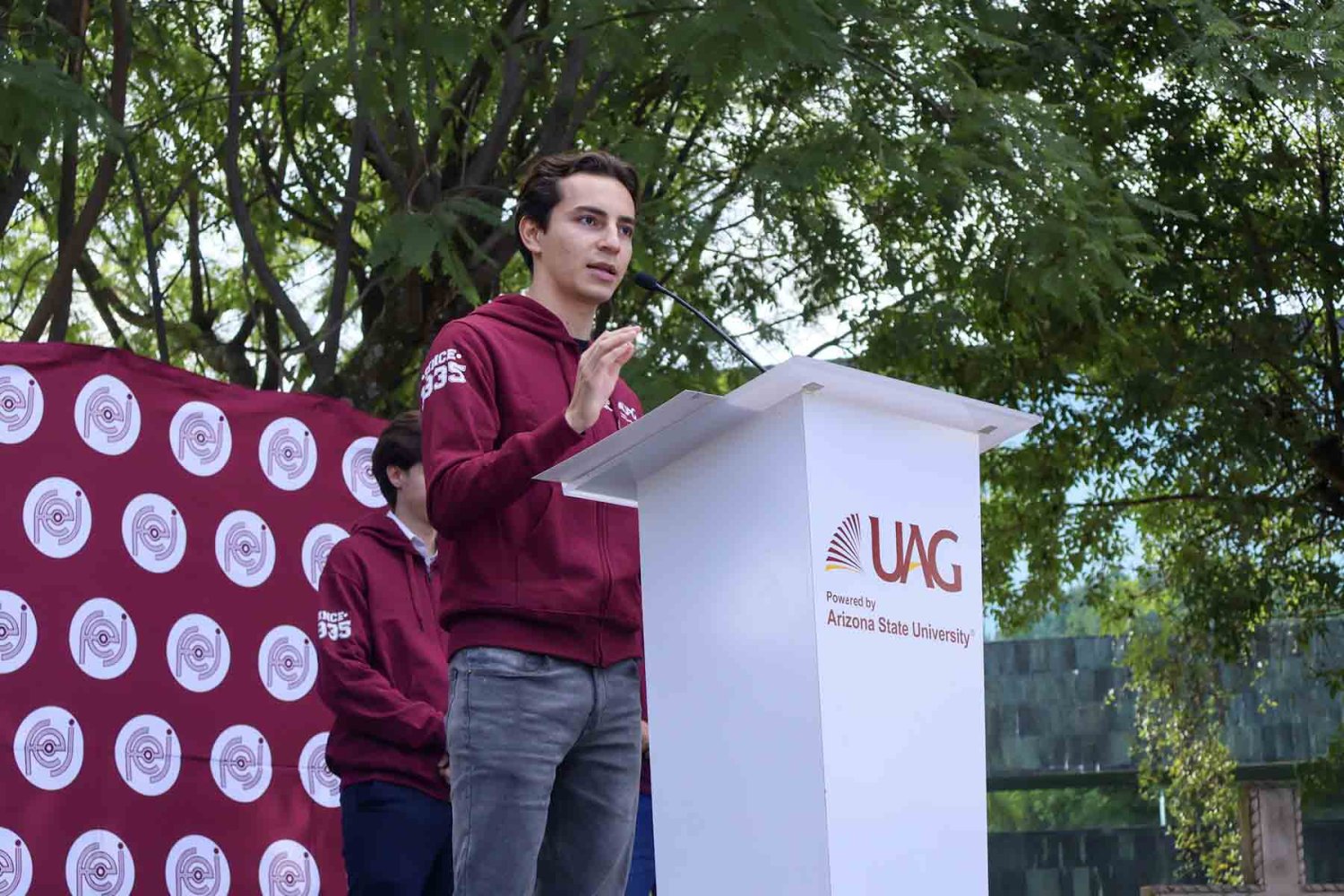 En el mismo evento, el Presidente de la Federación de Estudiantes de Jalisco (FEJ) Carlos Jesús Esparza, también compartió un mensaje en el que aseguró que la UAG fue fundada por estudiantes que lucharon por su amor a la patria, a la libertad y a la verdad, lo que forjó así los cimientos de una mejor sociedad.