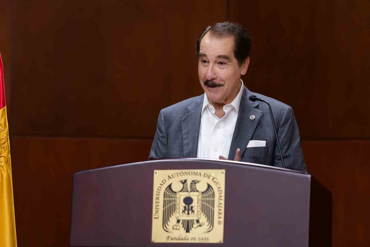 El Lic. Antonio Leaño Reyes, Rector de la UAG, en la ceremonia destacó que la filatelia es una expresión que une cultura y memoria, por ello, para esta institución es un privilegio participar en esta ceremonia en la que reafirma su compromiso con la preservación del conocimiento, el arte y el sentido de pertenencia nacional.