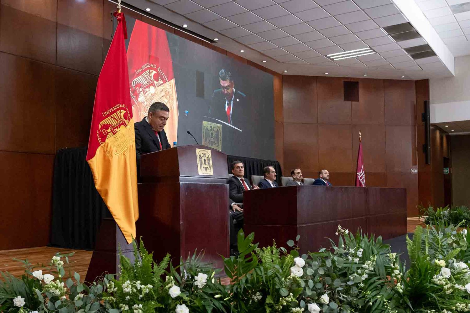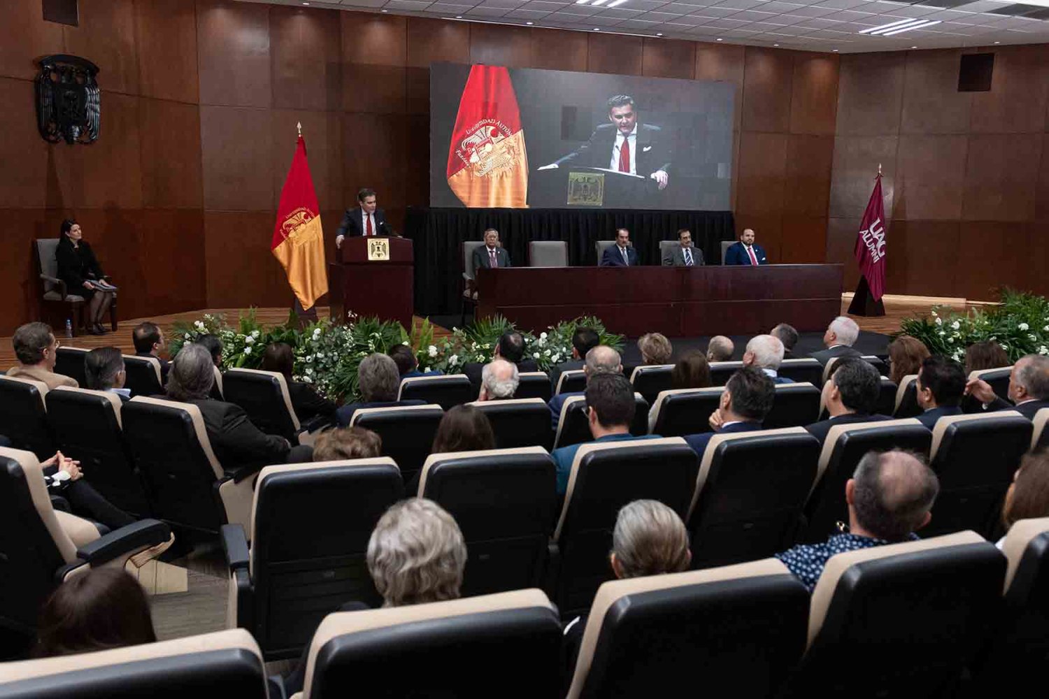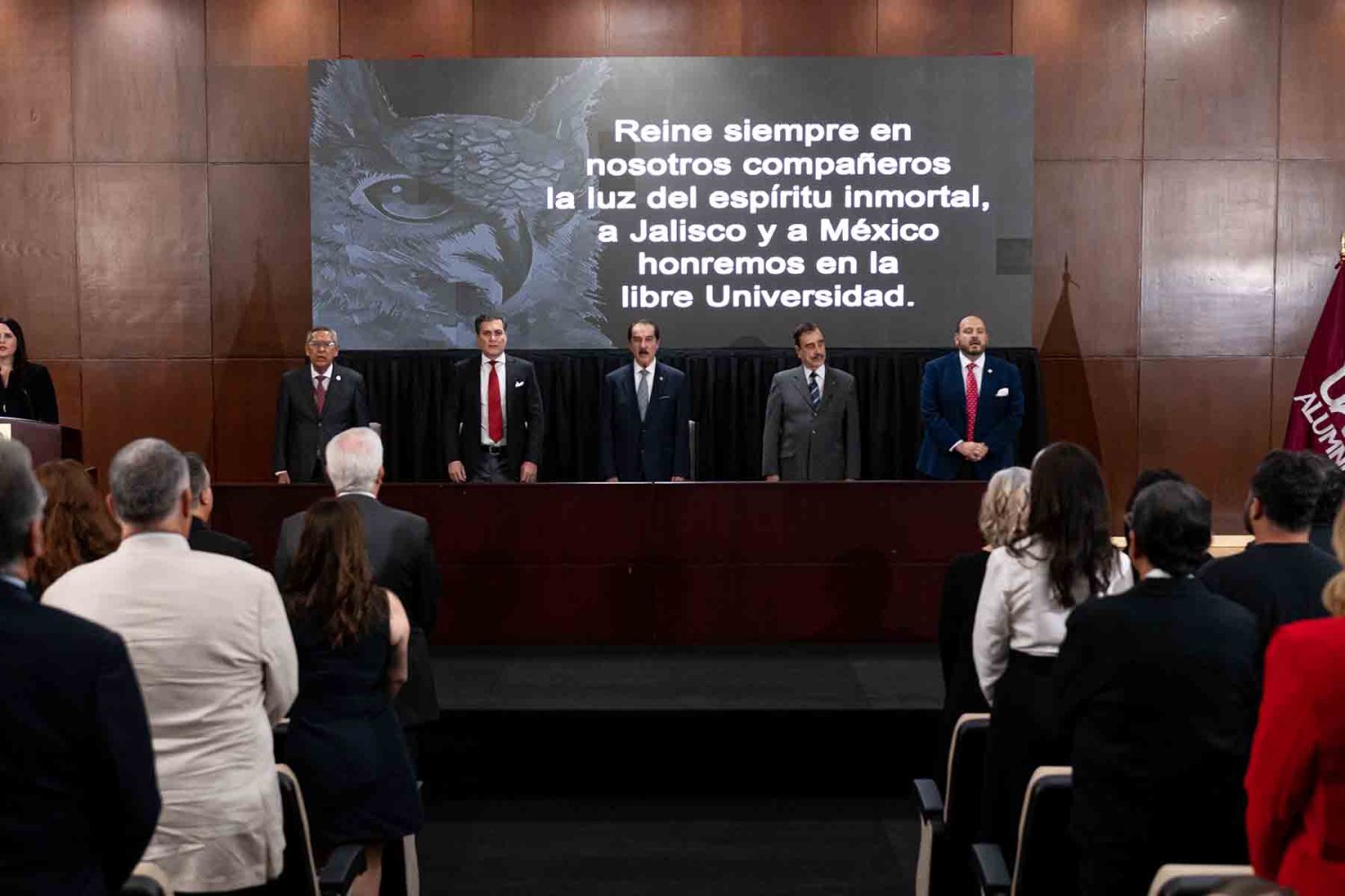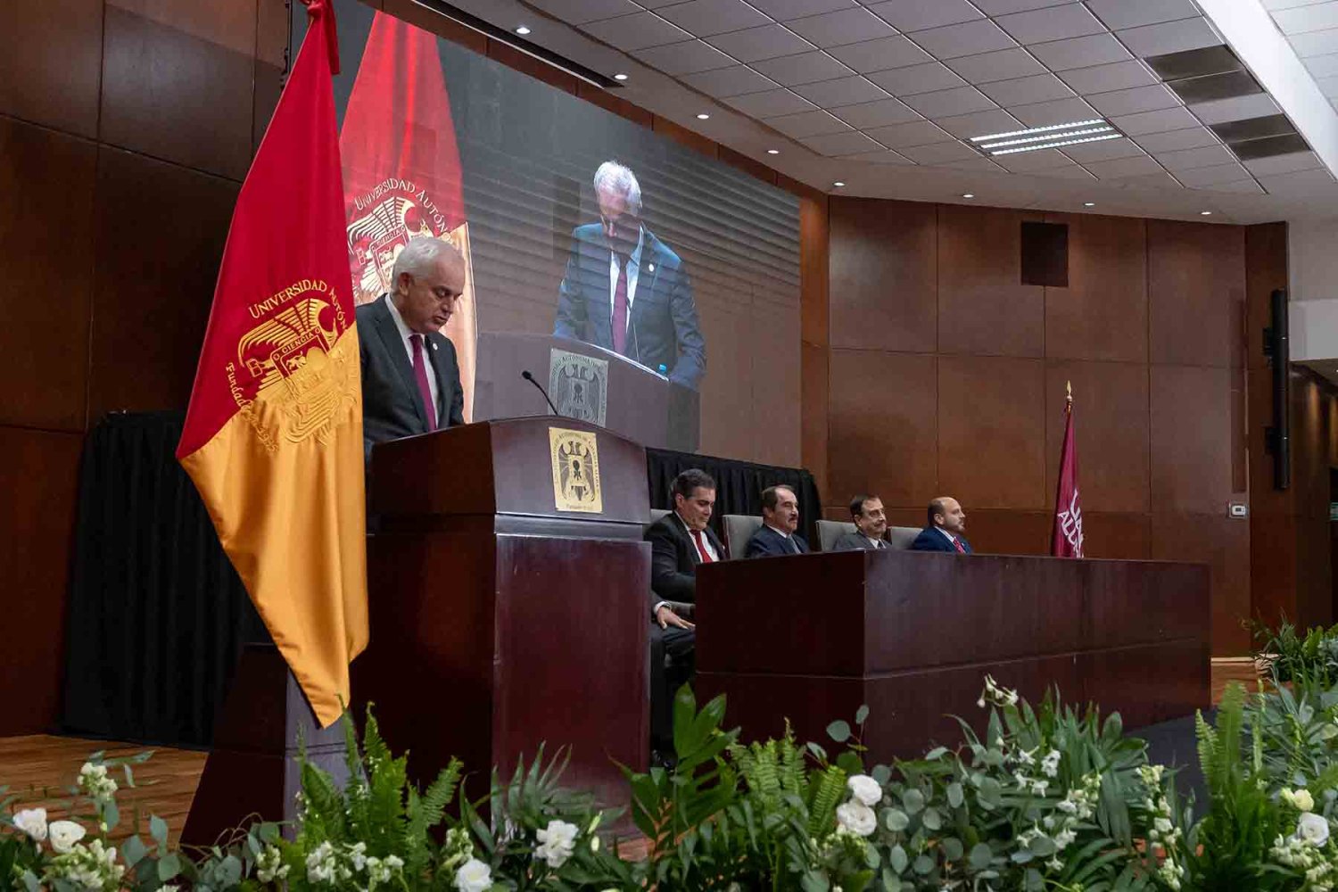 En el presídium estuvieron el Rector, Lic. Antonio Leaño Reyes; Vicerrector General, Lic. Antonio Leaño del Castillo; Vicerrector Académico Emérito, Dr. Néstor Velasco Pérez; Secretario General, Dr. Ricardo Beltrán Rojas; y el Presidente Nacional de la Asociación de Egresados UAG, Mtro. Ariosto Manrique Moreno.