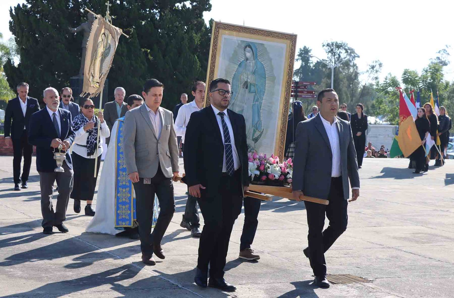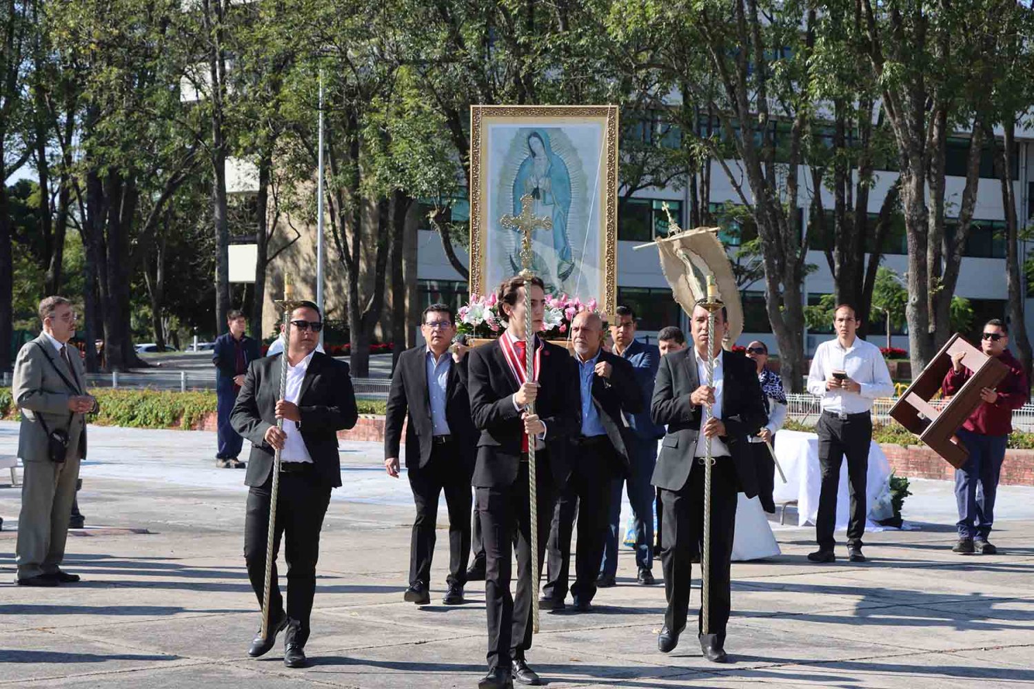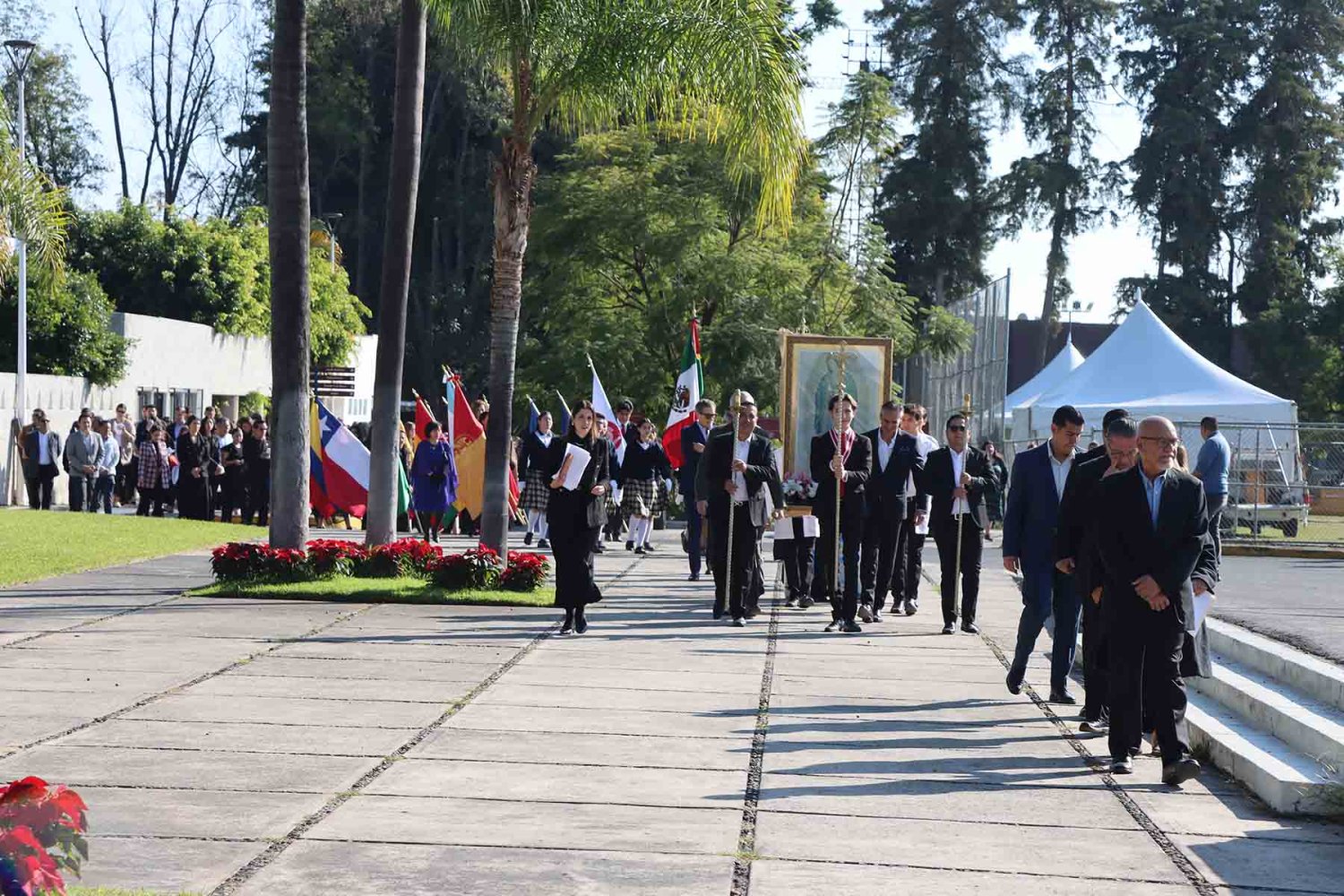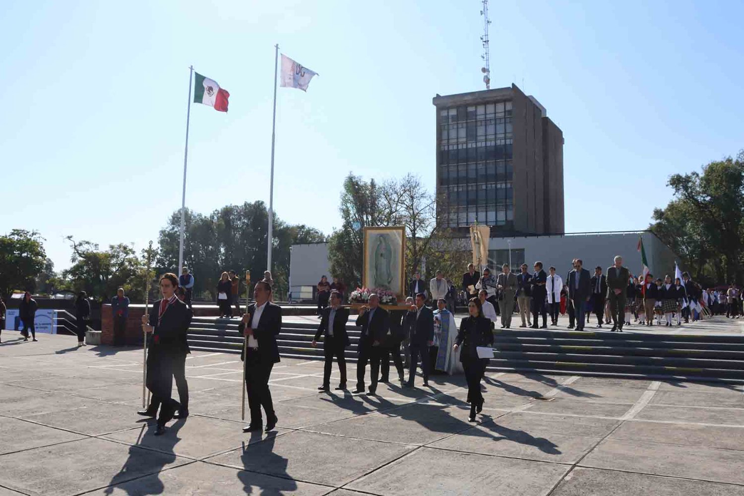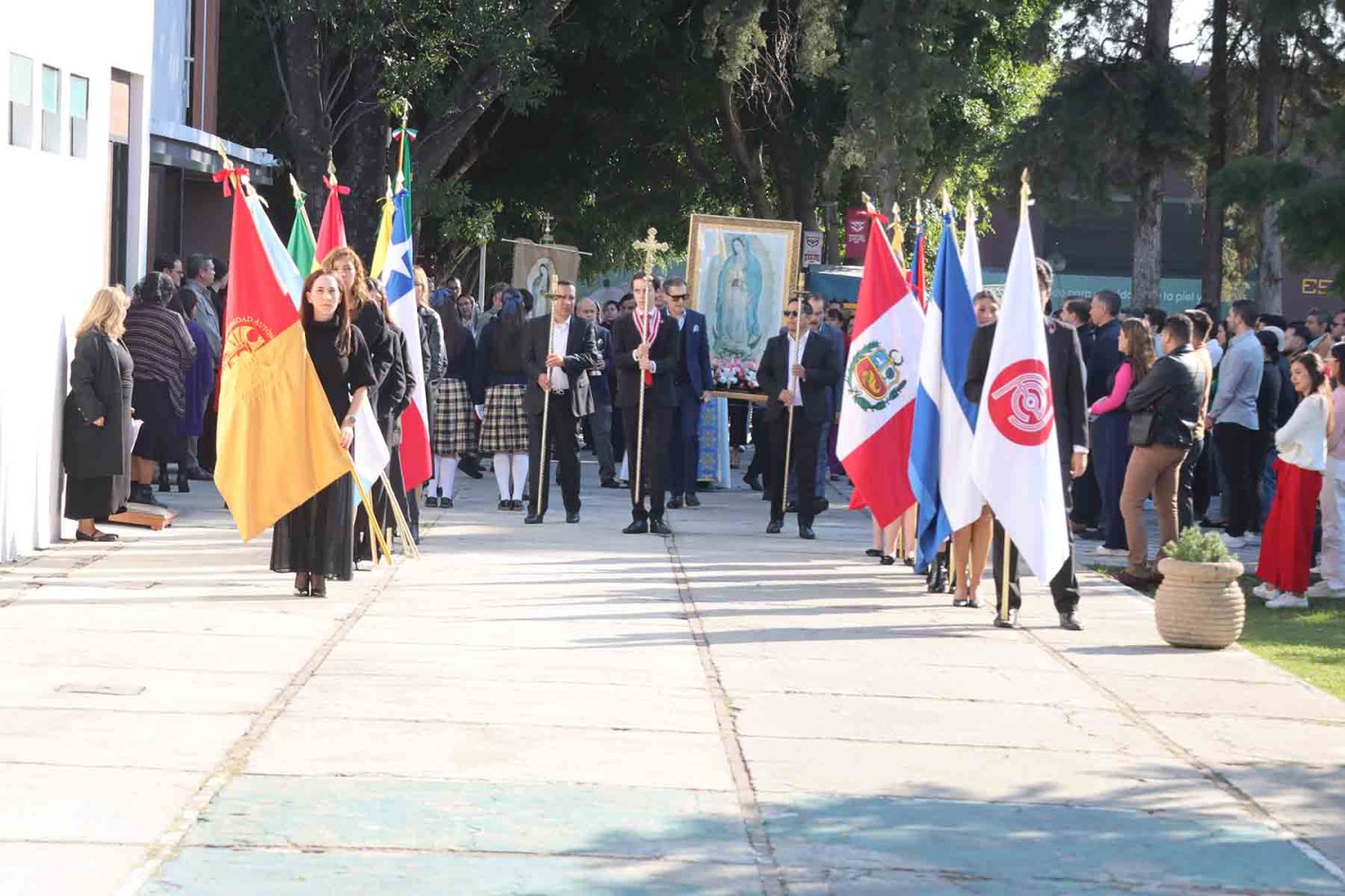 El recorrido inició con la imagen de la Virgen de Guadalupe, portada en andas junto con su estandarte. Detrás de ella avanzaron las autoridades universitarias, seguidas por la escolta de la Secundaria de la Escuela Antonio Caso Zapopan, así como por las banderas de México, de la UAG, de la Federación de Estudiantes de Jalisco (FEJ), del Club Secretarial y de diversas naciones de América Latina.