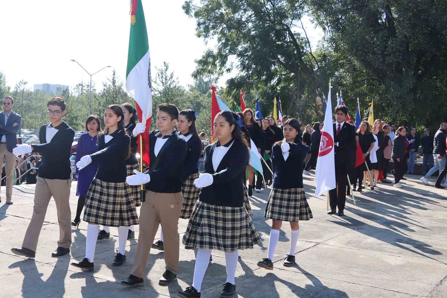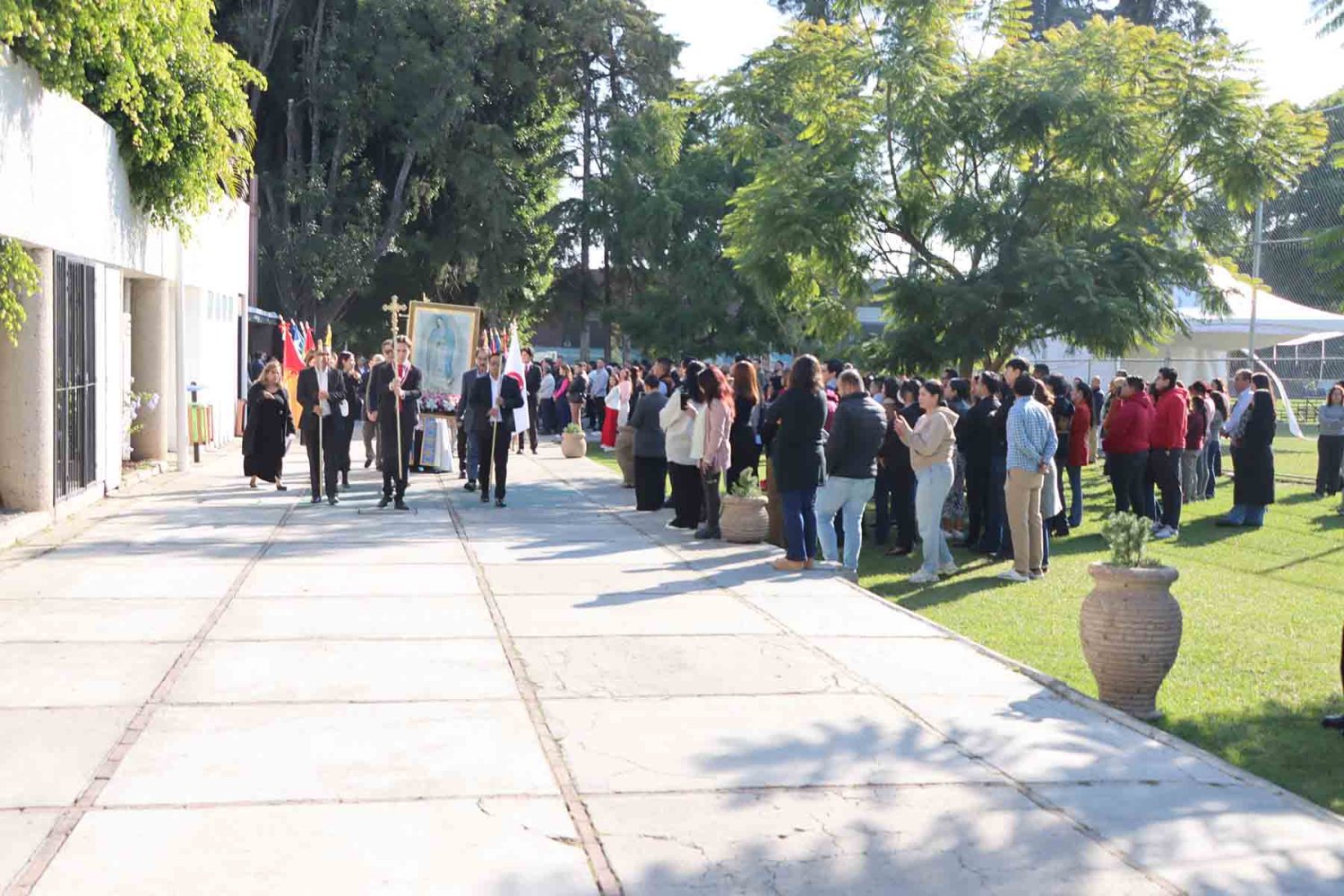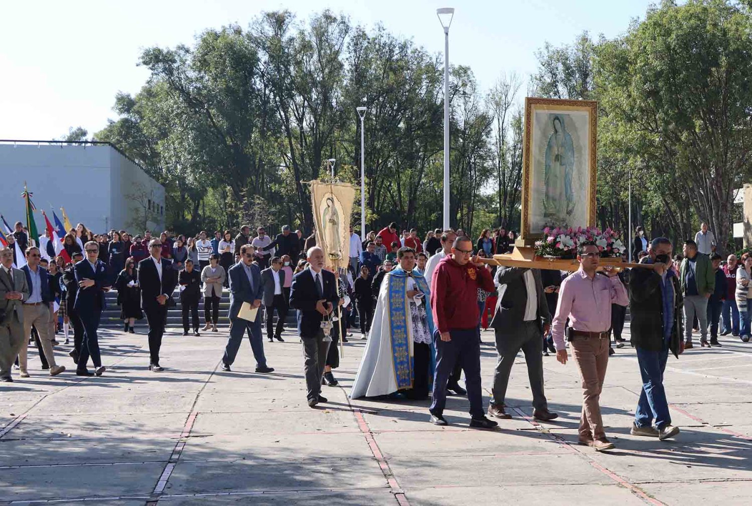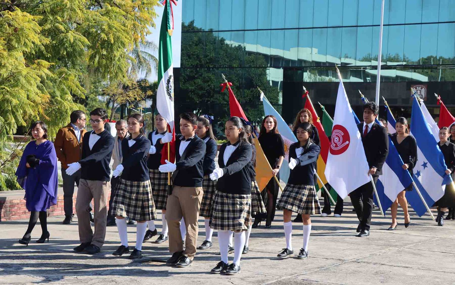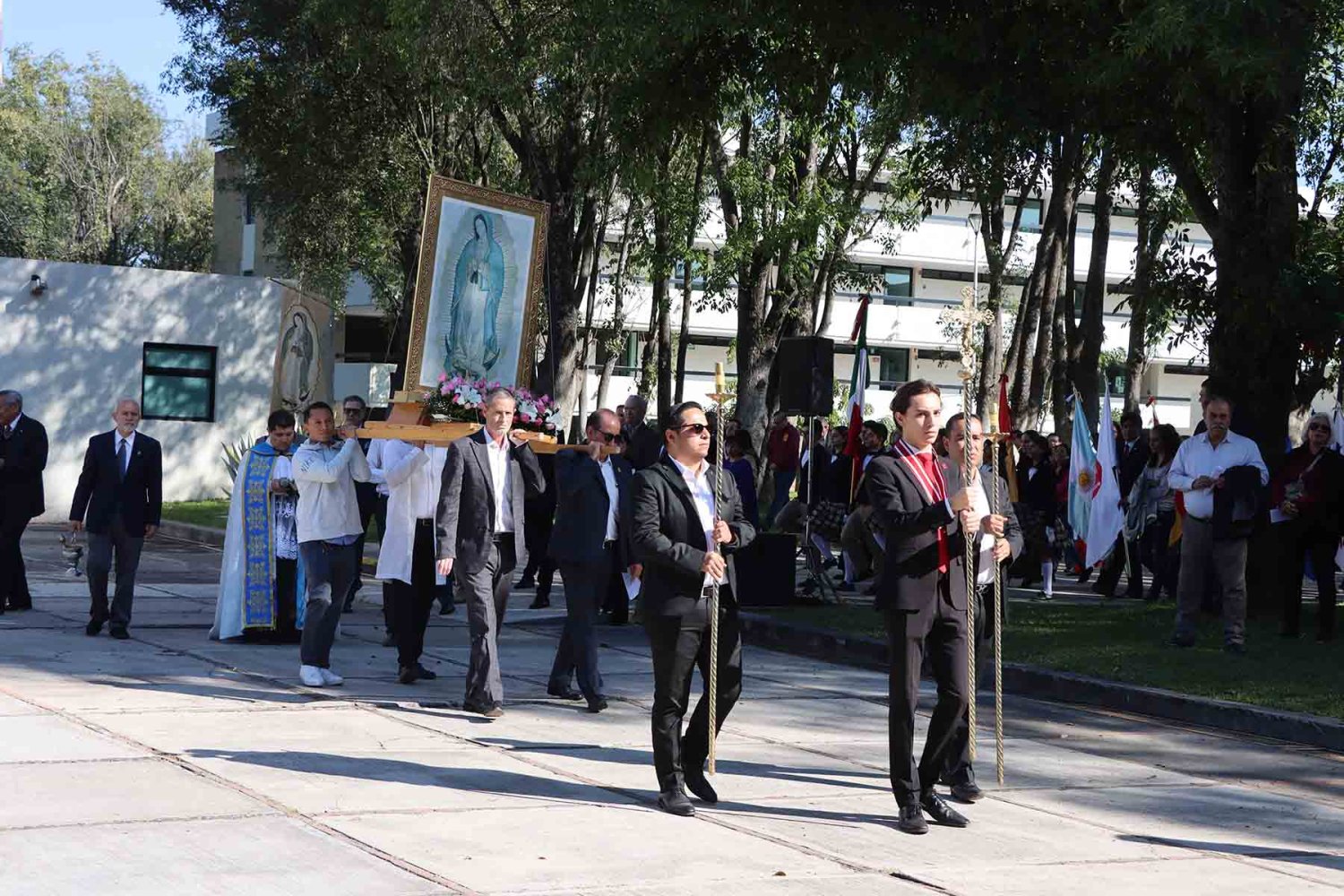 El recorrido inició con la imagen de la Virgen de Guadalupe, portada en andas junto con su estandarte. Detrás de ella avanzaron las autoridades universitarias, seguidas por la escolta de la Secundaria de la Escuela Antonio Caso Zapopan, así como por las banderas de México, de la UAG, de la Federación de Estudiantes de Jalisco (FEJ), del Club Secretarial y de diversas naciones de América Latina.