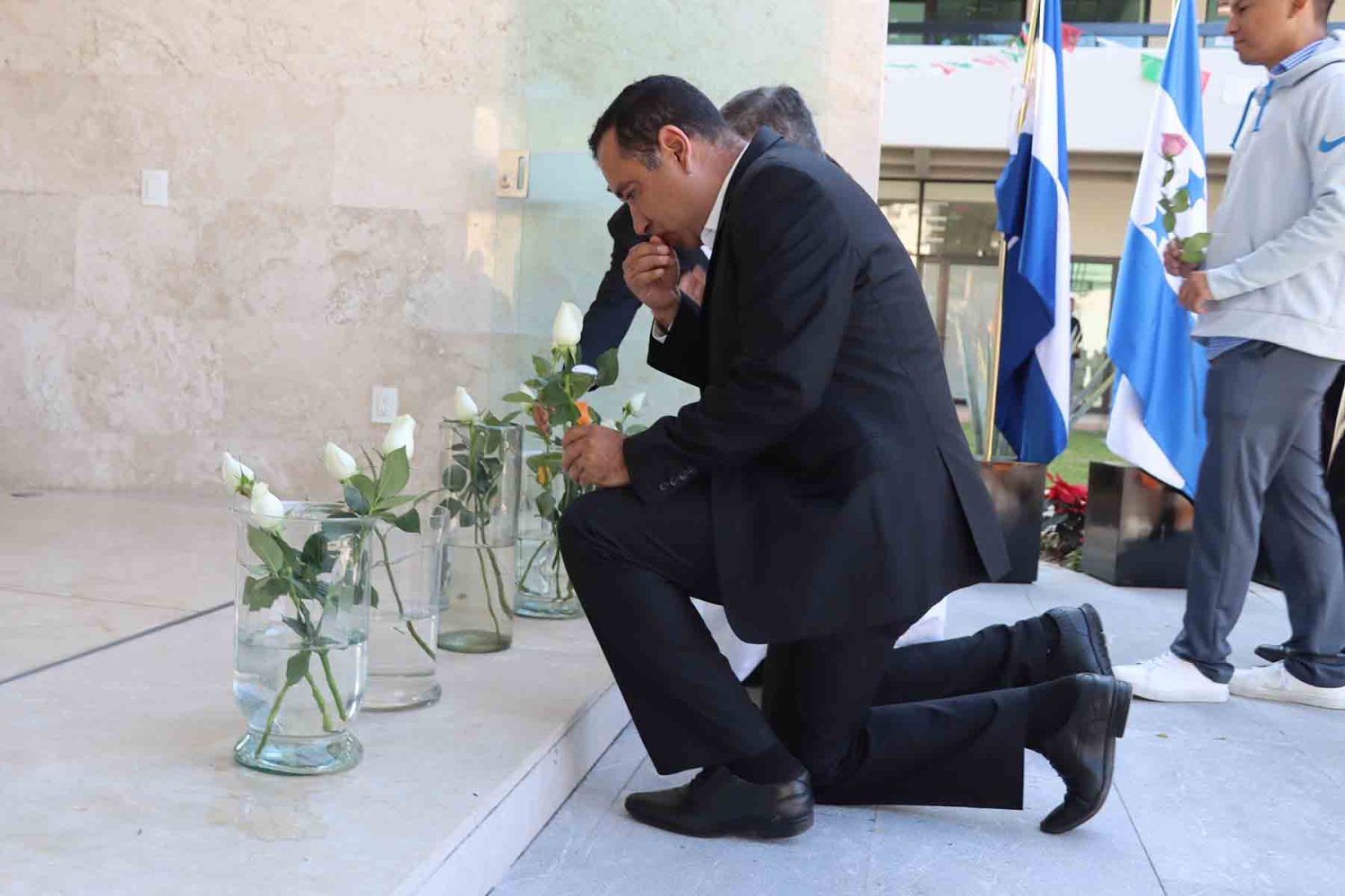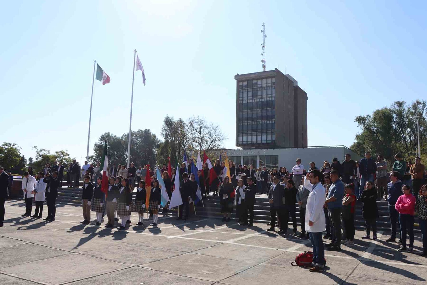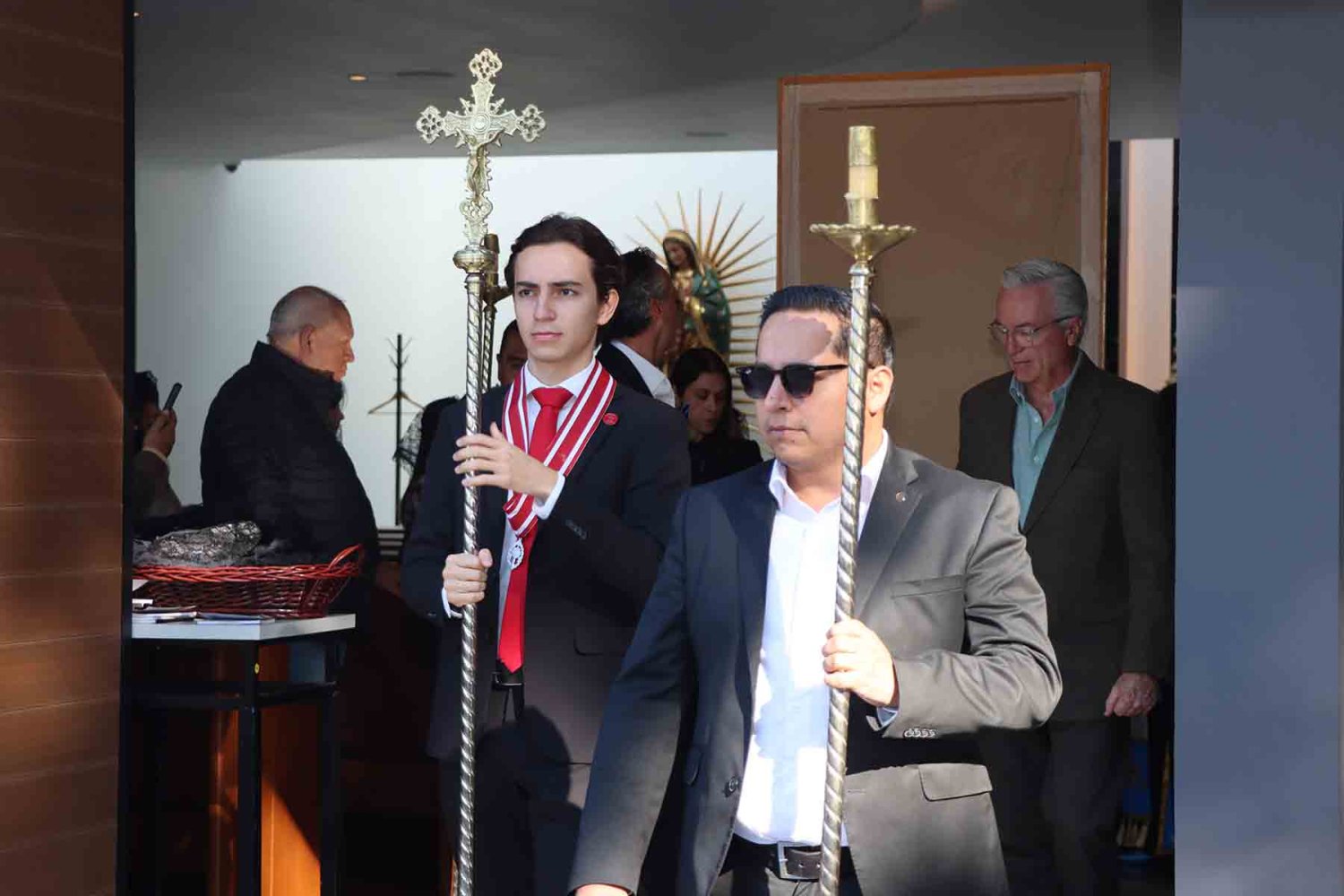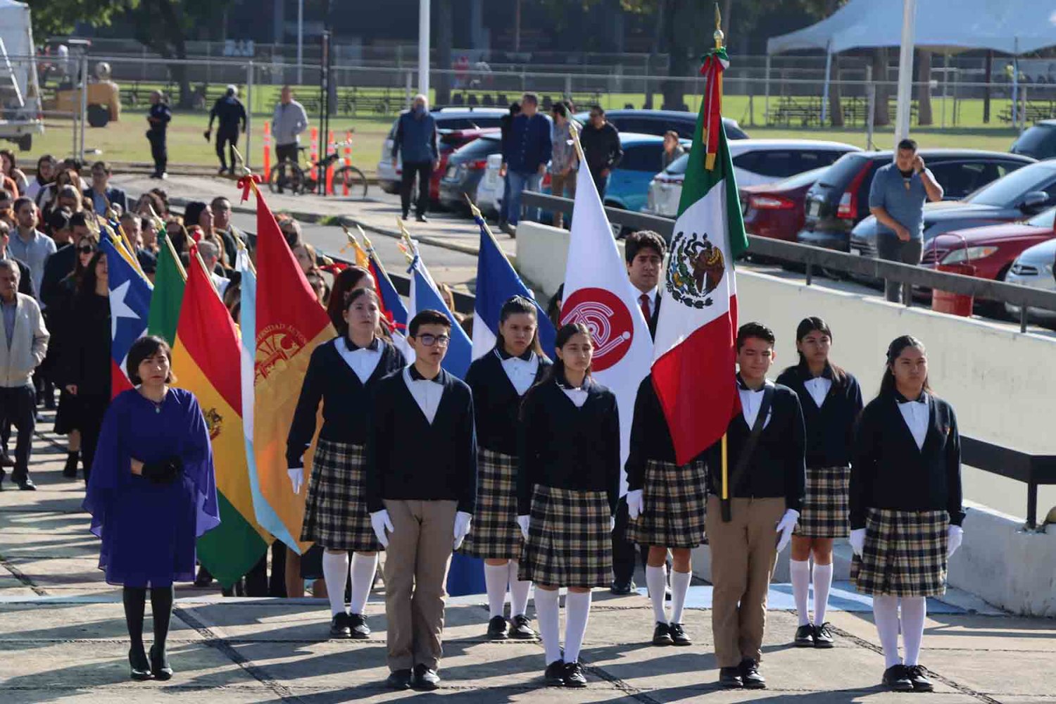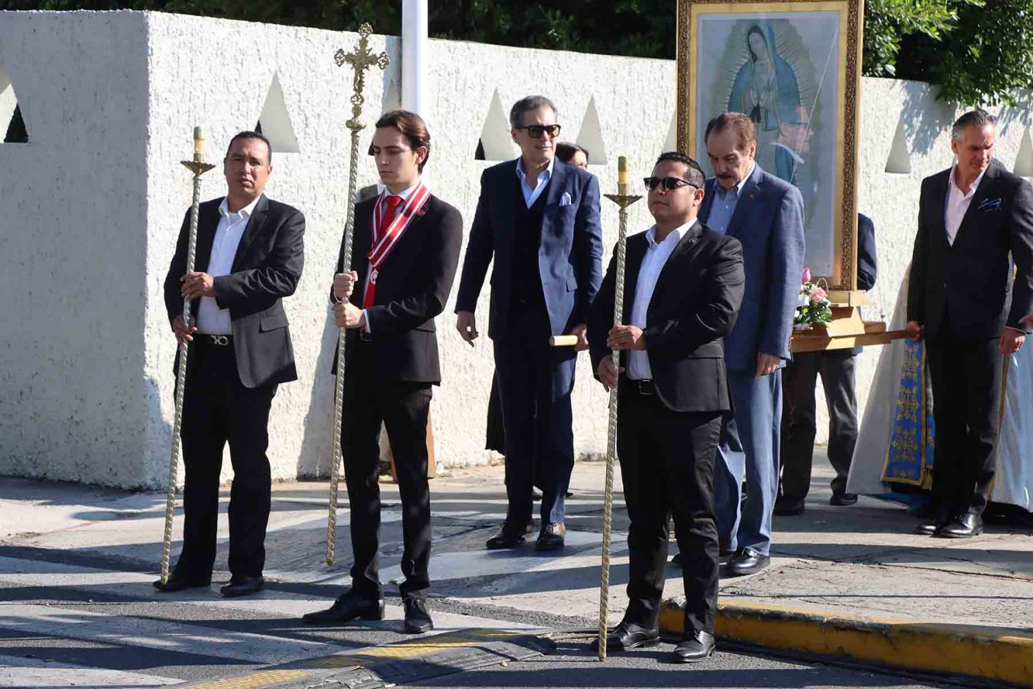 El recorrido inició con la imagen de la Virgen de Guadalupe, portada en andas junto con su estandarte. Detrás de ella avanzaron las autoridades universitarias, seguidas por la escolta de la Secundaria de la Escuela Antonio Caso Zapopan, así como por las banderas de México, de la UAG, de la Federación de Estudiantes de Jalisco (FEJ), del Club Secretarial y de diversas naciones de América Latina.