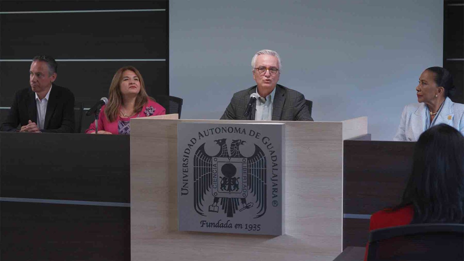 Durante la rueda de prensa, realizada en la Sala de Juicios Orales de la UAG, el Dr. Alfonso Petersen Farah, Vicerrector Académico y de Ciencias de la