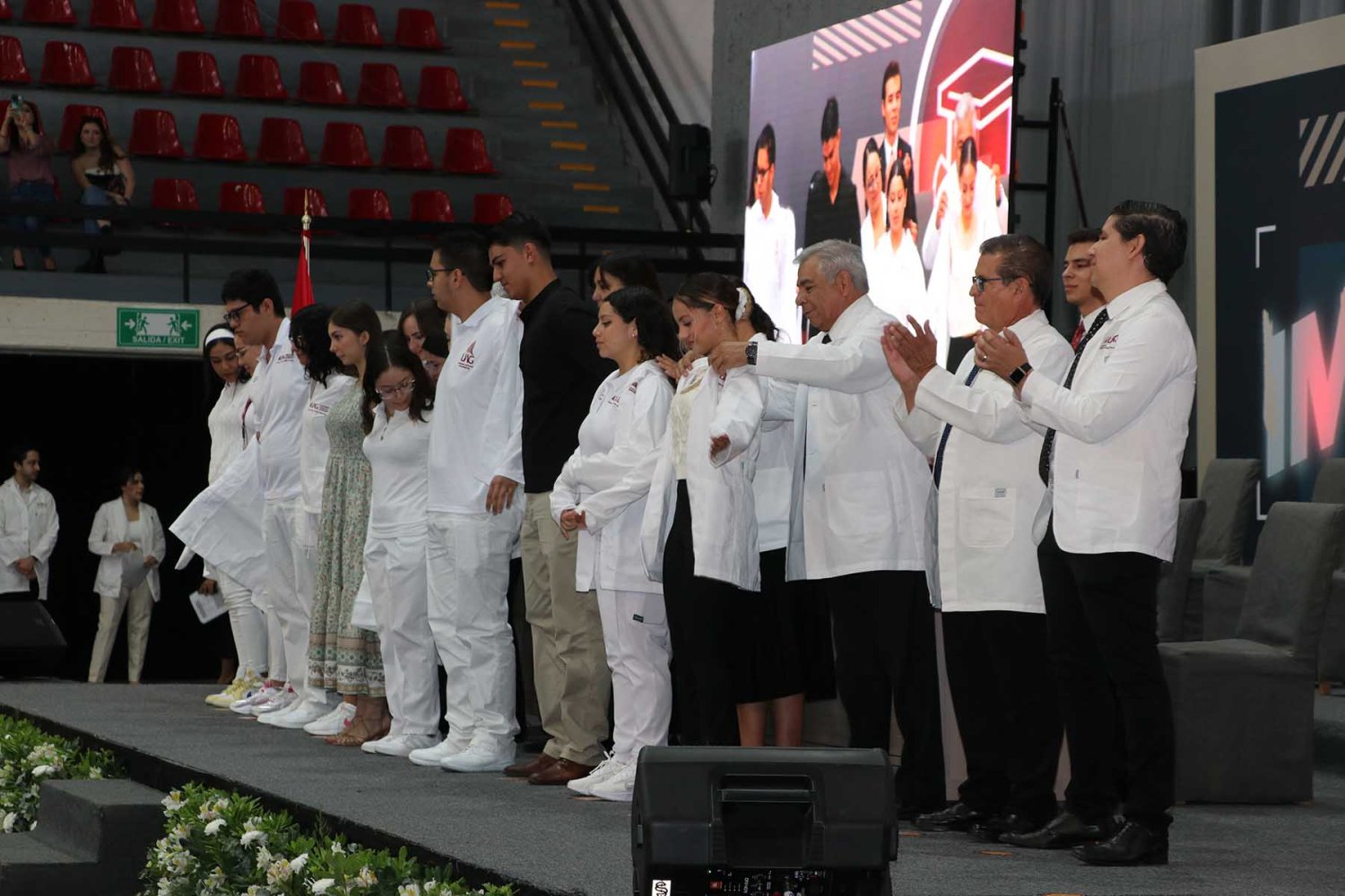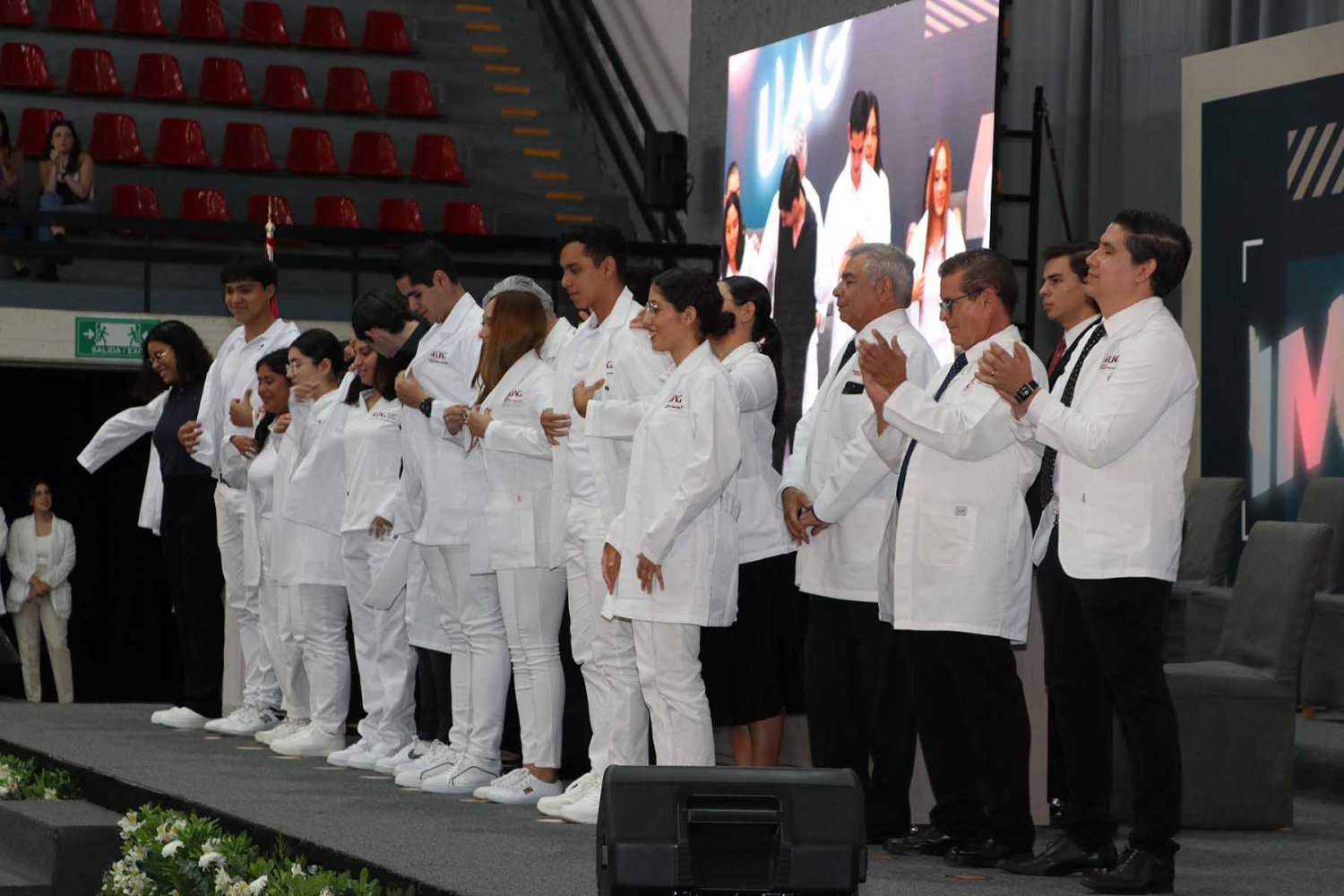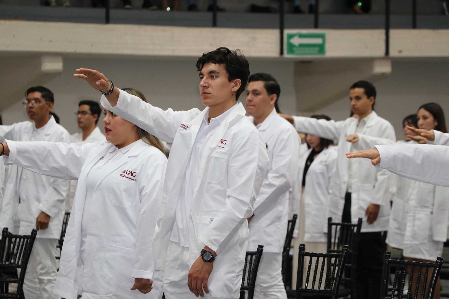 Después, cada uno de los alumnos del programa de Medicina UAG fueron mencionados por su nombre para pasar al frente del estrado, donde las autoridades universitarias correspondientes les colocaran su primera bata blanca.