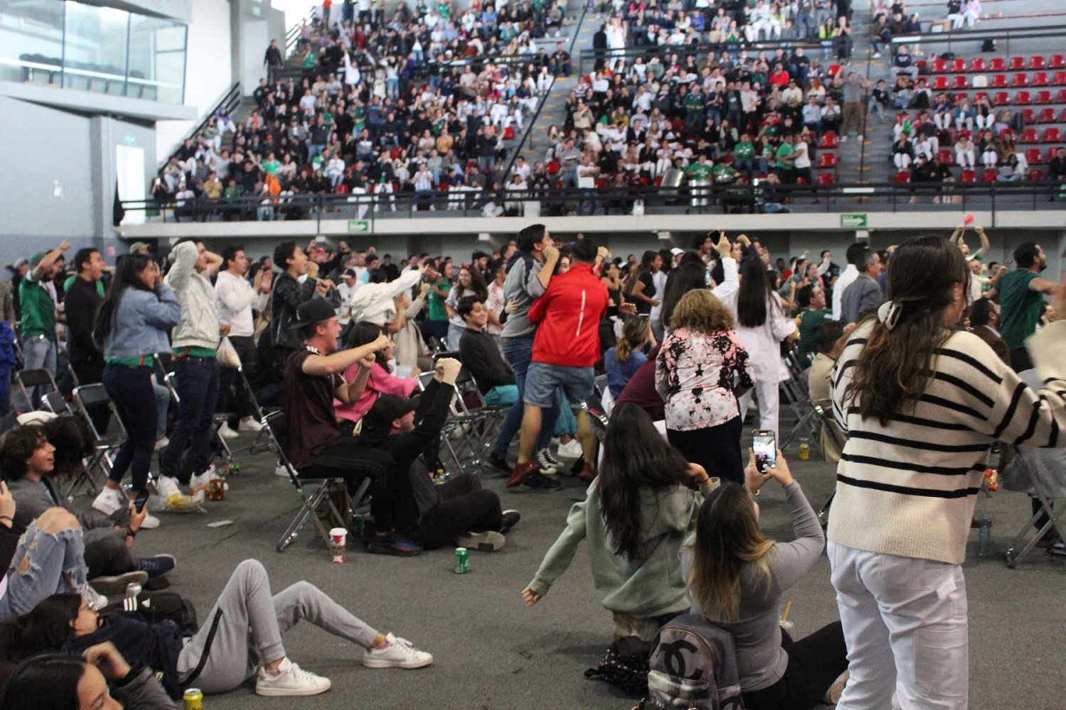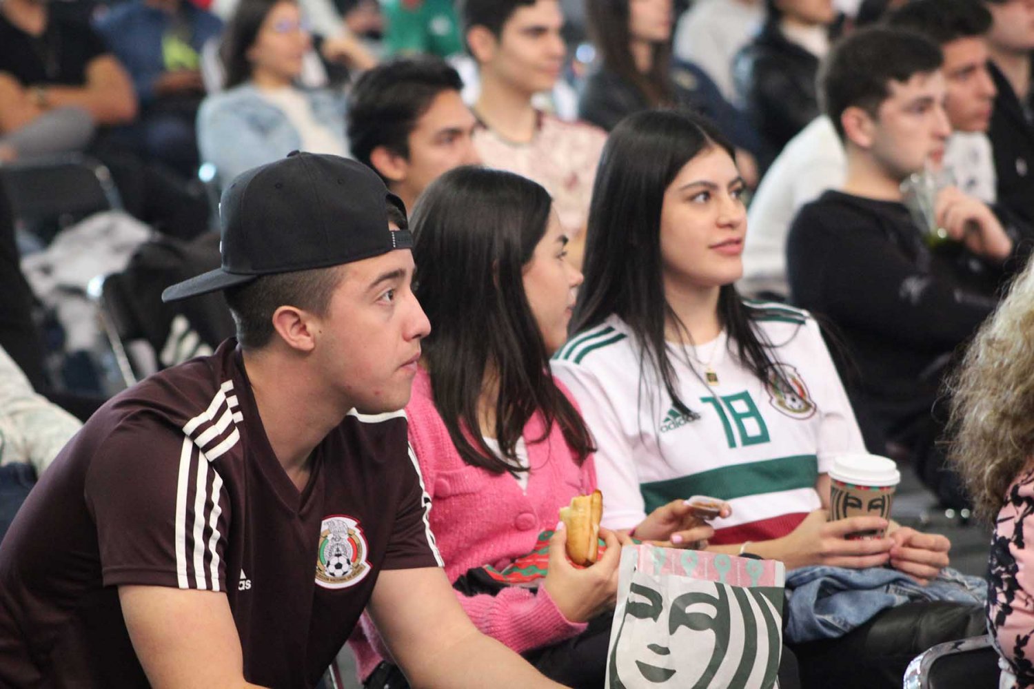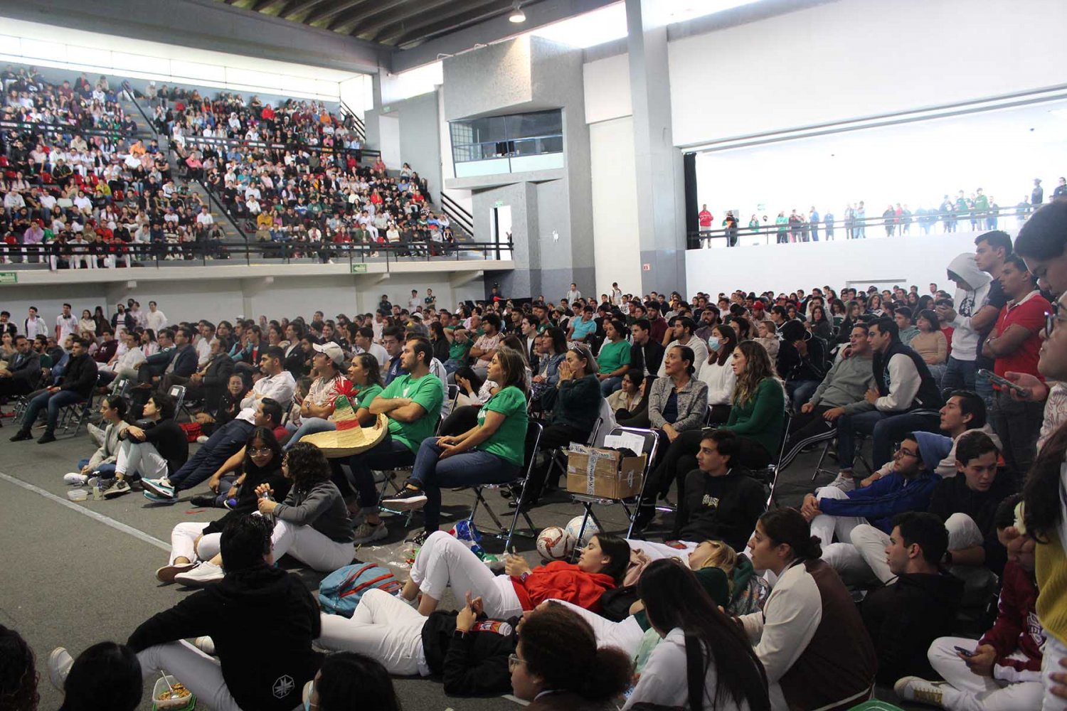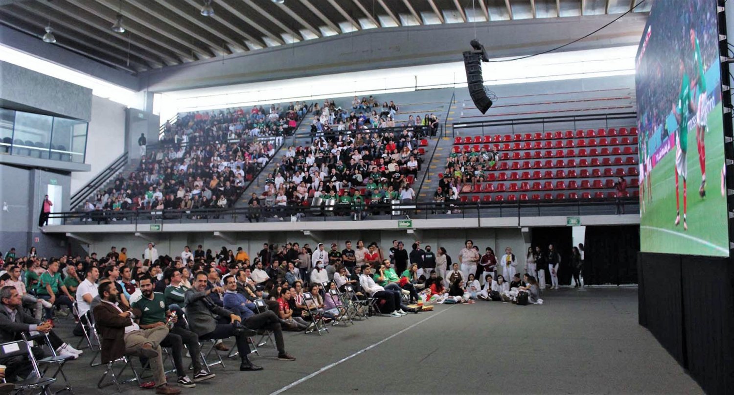 Estudiantes, académicos y colaboradores disfrutan del primer partido de la selección en pantalla gigante ubicada en el Gimnasio Universitario.